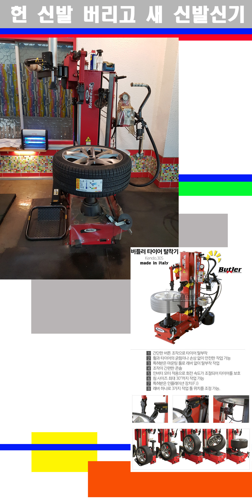 이태리 버틀러사의 켄도3.0S는 휠과 타이어와 조립과 분리시 전혀 제품에 손상을 주지않는 탈착기로 특히 센터락방식(중앙에서 휠를 고정하는 방식)이여서 휠의 중앙부위 잡아서 타이어를 탈부착하고 이후 상하롤러로 타이어를 탈부착합니다 특히 유니포미티작업(휠의 가장가벼운부분과 타이어의 가장 무거운부분을 매칭시키는 작업)시 작업자가 타이어를 정확한 지점에 휠과 매칭시킬수 있는 장점도 있습니다