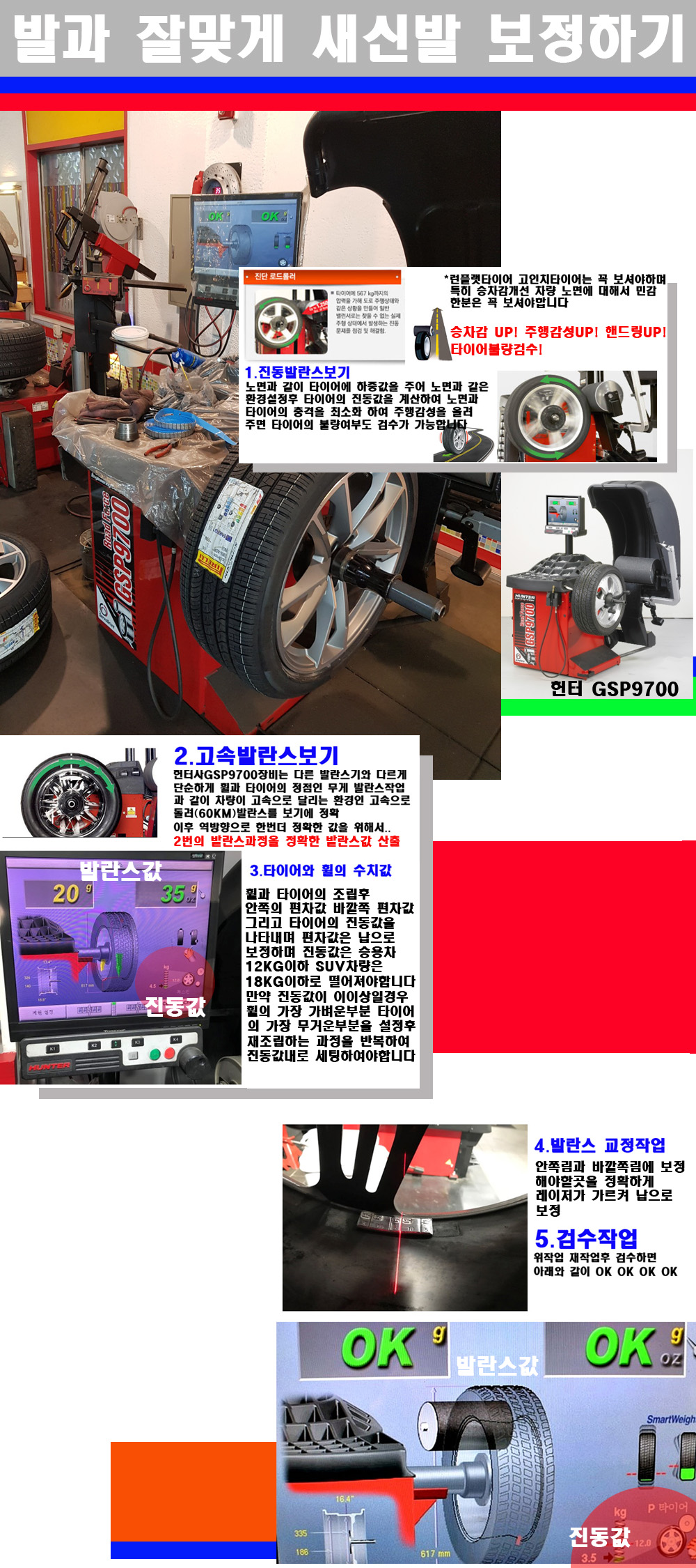 그리고 작업자에게는 불필요한 발란스납을 붙이지 않아 미관상으로 좋고 납을 절약하는 고객님에게도윈이고 작업자에게도 윈윈할수 있는 장비입니다 그리고 시중에서 고속진동발란스라고 말하시는 샵들이 많은데 꼭아셔야하는것은 고속발란스는 말그대로 발란스를 볼때 고속으로 돌리기에 60키로 전후 그리고 진동값을 계산하기위해서는 발란스기에 진동롤러가 있어야합니다 그래서 미국헌터사 GSP9700장비가 유일합니다 다른 샵에서 말하는 발란스기는 고속진동발란스기능없는 일반발란스 기기입니다 이점 꼭 아시고 장착하시기를 바랍니다