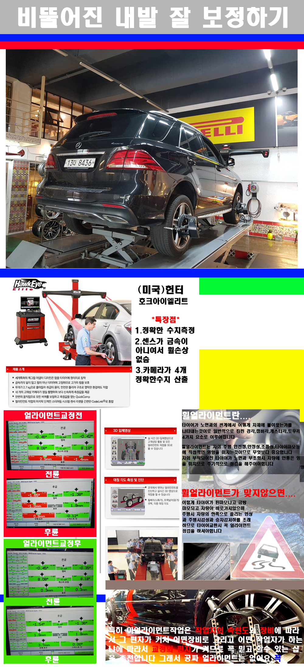 자사는 얼라이먼트정렬시 교정전 교정후를 구분하여 고객님께 직접 이수치값을 확인시켜드리고 작업을 하며 이후 각각의 특성을 가진 타이어들에 대해서 설명 및 관리요령 운전요령 같이 설명해드리고 있습니다