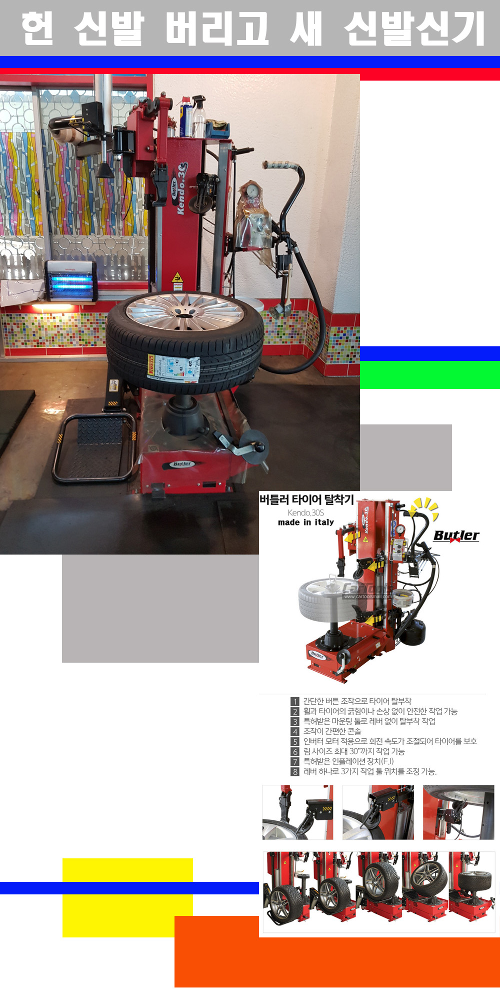이태리 버틀러사의 켄도3.0S는 휠과 타이어와 조립과 분리시 전혀 제품에 손상을 주지않는 탈착기로 특히 센터락방식(중앙에서 휠를 고정하는 방식)이여서 휠의 중앙부위 잡아서 타이어를 탈부착하고 이후 상하롤러로 타이어를 탈부착합니다 특히 유니포미티작업(휠의 가장가벼운부분과 타이어의 가장 무거운부분을 매칭시키는 작업)시 작업자가 타이어를 정확한 지점에 휠과 매칭시킬수 있는 장점도 있습니다