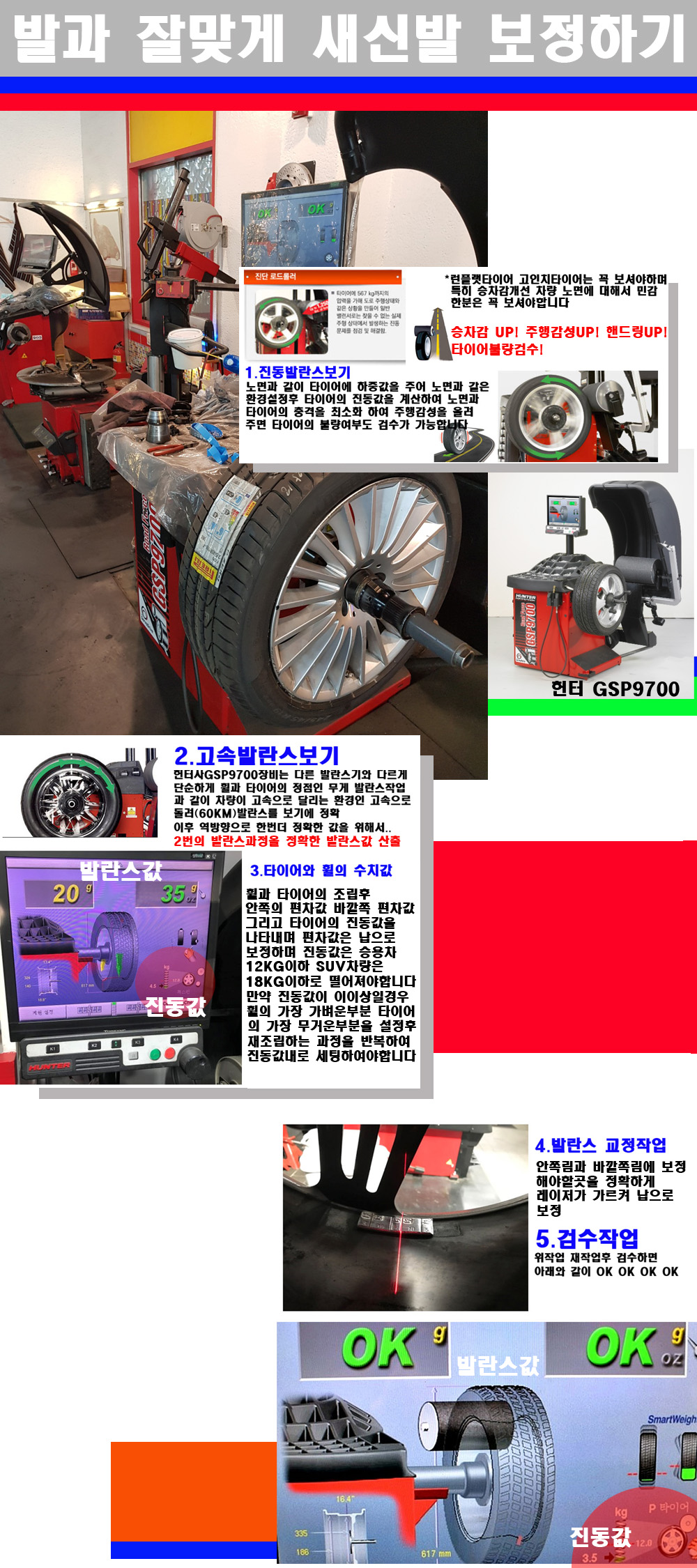 그리고 작업자에게는 불필요한 발란스납을 붙이지 않아 미관상으로 좋고 납을 절약하는 고객님에게도윈이고 작업자에게도 윈윈할수 있는 장비입니다 그리고 시중에서 고속진동발란스라고 말하시는 샵들이 많은데 꼭아셔야하는것은 고속발란스는 말그대로 발란스를 볼때 고속으로 돌리기에 60키로 전후 그리고 진동값을 계산하기위해서는 발란스기에 진동롤러가 있어야합니다 그래서 미국헌터사 GSP9700장비가 유일합니다 다른 샵에서 말하는 발란스기는 고속진동발란스기능없는 일반발란스 기기입니다 이점 꼭 아시고 장착하시기를 바랍니다