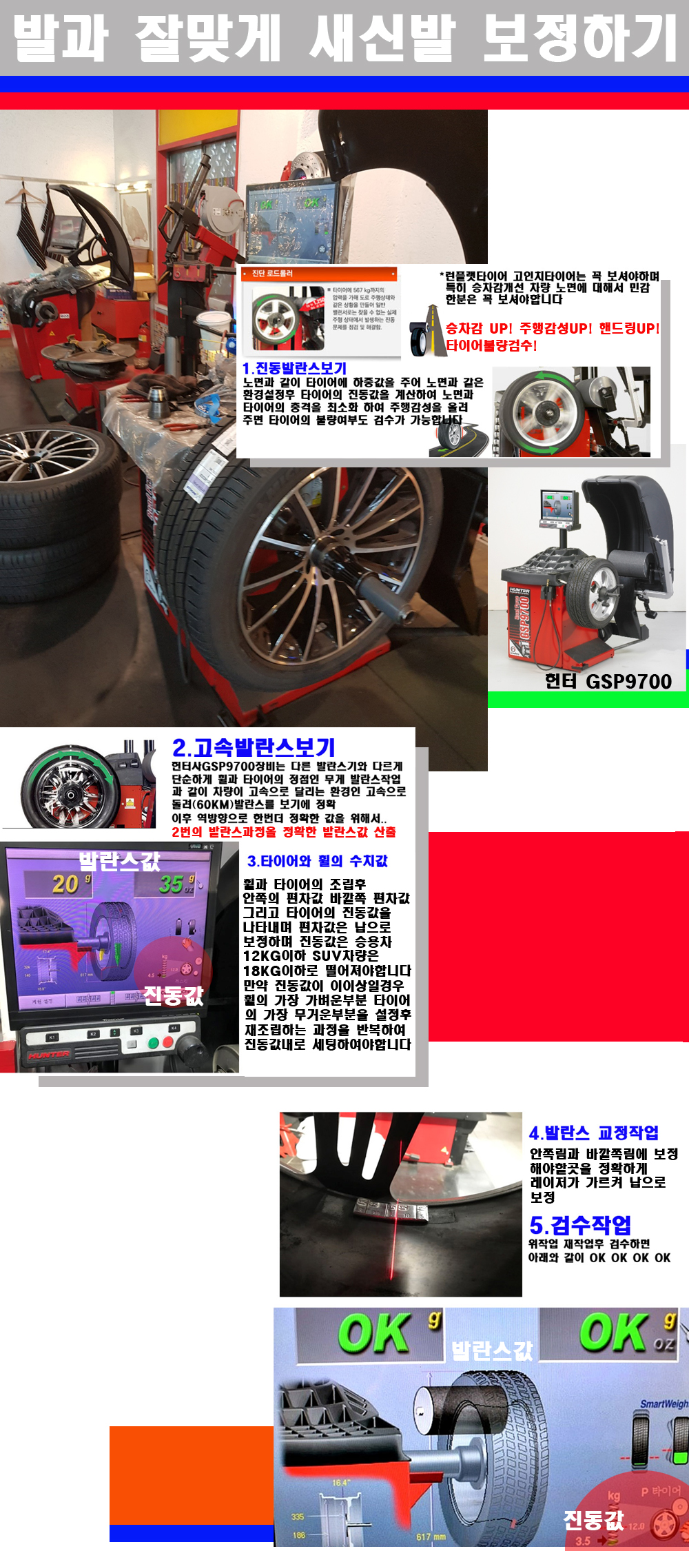 그리고 작업자에게는 불필요한 발란스납을 붙이지 않아 미관상으로 좋고 납을 절약하는 고객님에게도윈이고 작업자에게도 윈윈할수 있는 장비입니다 그리고 시중에서 고속진동발란스라고 말하시는 샵들이 많은데 꼭아셔야하는것은 고속발란스는 말그대로 발란스를 볼때 고속으로 돌리기에 60키로 전후 그리고 진동값을 계산하기위해서는 발란스기에 진동롤러가 있어야합니다 그래서 미국헌터사 GSP9700장비가 유일합니다 다른 샵에서 말하는 발란스기는 고속진동발란스기능없는 일반발란스 기기입니다 이점 꼭 아시고 장착하시기를 바랍니다