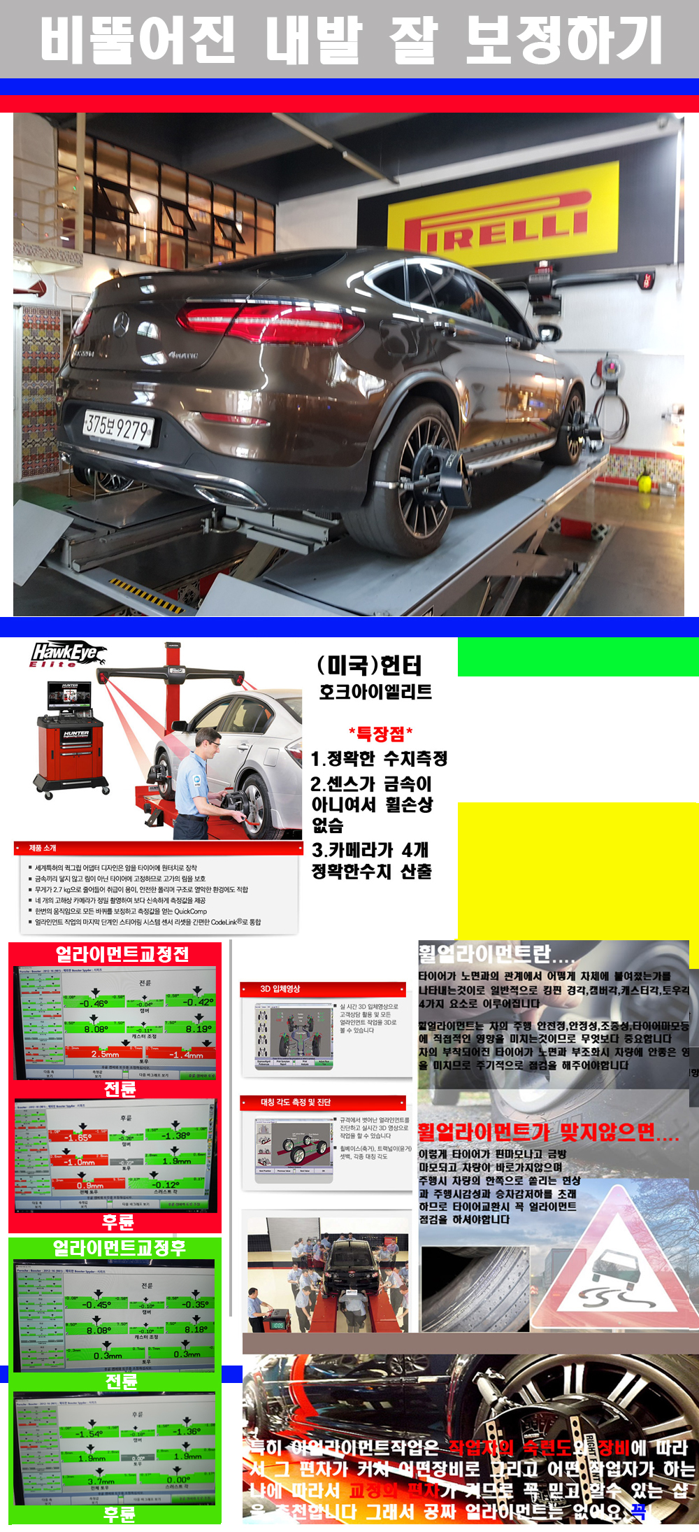 자사는 얼라이먼트정렬시 교정전 교정후를 구분하여 고객님께 직접 이수치값을 확인시켜드리고 작업을 하며 이후 각각의 특성을 가진 타이어들에 대해서 설명 및 관리요령 운전요령 같이 설명해드리고 있습니다
