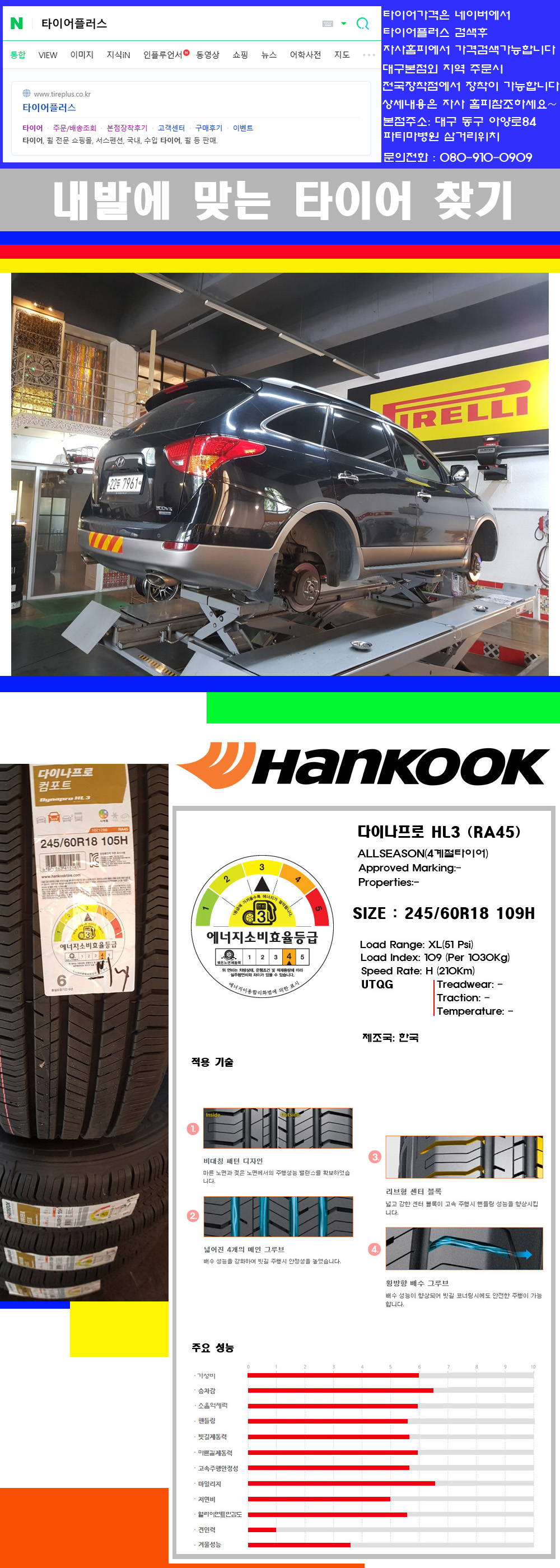 ♥♥♥본점 대구 동구 아양로84 (파티마삼거리 위치) 국산 수입타이어 할인행사중♥♥♥ 현재 국내3사 SUV타이어는 OEM타이어 이후 RE용 프리미엄 타이어는 한국타이어 HL3 금호타이어 KL33 HP71 넥센타이어 슈프림 GTX 5가지가 많이 팔리는 제품입니다 금호타이어을 먼저 설명하면 보통 차량의 순정품으로 많이장착되어지는 KL33은 내마모성이 좋아 오랜 기간동안 사용이 가능한 제품이고 단지 사용시 소음이 많이 올라오는 단점이 있습니다 후속으로 나오는 금호타이어 크루젠 HP71은 이런 KL33의 단점을 보완한 제품입니다 트레드웨어 KL33 440 HP71 540이렇게 UGQG값이 나오지만 패턴의 성상이나 이후 저희들이 작업을 해드리고 사용하시는 것을 봤을때 가격대가 조금높은 위의 등급인 HP71를 권장합니다 후속모델인 HP71이 주행성능쪽으로 개선한것은 사실이지만 SUV타이어의 견인력이나 내구성의 관점에서 봤을때는 KL33이 조금더 우수해보입니다 그리고 HP71은 패턴의 구조를 보면 블록간 격차가 좁지만 소음억제력은 3사의 한국타이어 다이나프로HL3 금호타이어 KL33 넥센타이어 슈프림 순으로 보입니다 넥센타이어 GTX는 3사타이어중 가장 가성비가 좋은 제품이며 위의 등급인 슈프림은 위 3가지 패턴중 가장 늦게 시장에 공급되어진 제품이여서 아마 이런 소비자들의 욕구들을 반영하여 설계지어 진듯 보입니다 품질면에서는 한국타이어쪽을 가성비쪽으로는 넥센타이어를 그리고 이런저런 조금씩 장점을 가진 금호타이어쪽으로 이런식으로 선택하시면될듯합니다 그리고 한국타이어 RA45는 타이어의 설계상 비대칭설계로 SUV가 주행시 바깥쪽으로 차량의 무게중심이동을 고려하여 바깥쪽 트레이드쪽을 더욱더 보강하여 SUV차량에 필요한 여러가지 요소들을 패턴설계에 반영하여 이상적인 패턴설계를 보여주며 한국타이어의 부드럽고 오래가는 특성도 같이 접목시켜 3사의 타이어중 가장 품질이 우수해 보입니다 그리고 정숙성과 승차감위주로 주행을 하시는 고객님에게는 한국타이어 RH17(S2ASX)를 권장합니다 그리고 넥센타이어의 슈프림은 3사타이어중 가장 긴마일리지로 설계된 제품으로 가성비위주타이어로 보시면 될듯하며 3사타이어중 겨울철성능이 우수해 보입니다 이런 저런 이유가 되든 고객님의 라이프스타일에 맞는 제품을 선택하셨서 오랜기간동안 사용하시기를 바랍니다 감사합니다