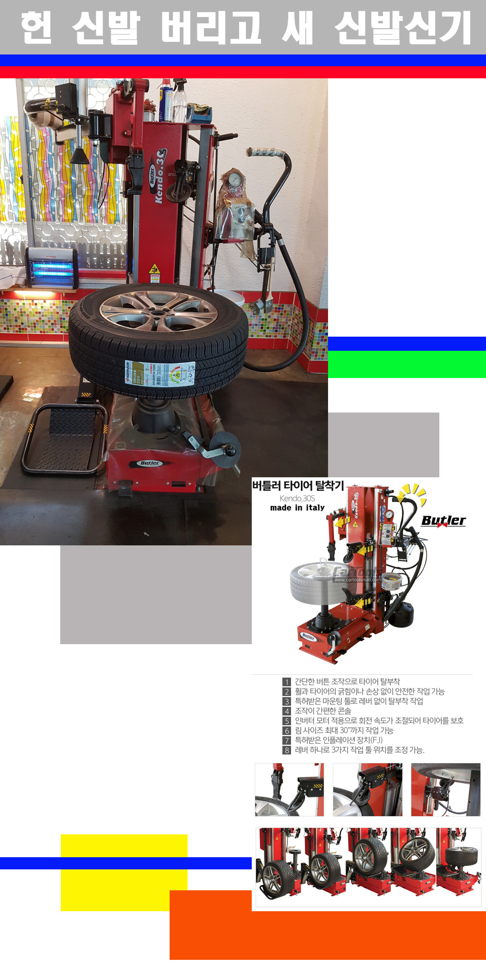 이태리 버틀러사의 켄도3.0S는 휠과 타이어와 조립과 분리시 전혀 제품에 손상을 주지않는 탈착기로 특히 센터락방식(중앙에서 휠를 고정하는 방식)이여서 휠의 중앙부위 잡아서 타이어를 탈부착하고 이후 상하롤러로 타이어를 탈부착합니다 특히 유니포미티작업(휠의 가장가벼운부분과 타이어의 가장 무거운부분을 매칭시키는 작업)시 작업자가 타이어를 정확한 지점에 휠과 매칭시킬수 있는 장점도 있습니다