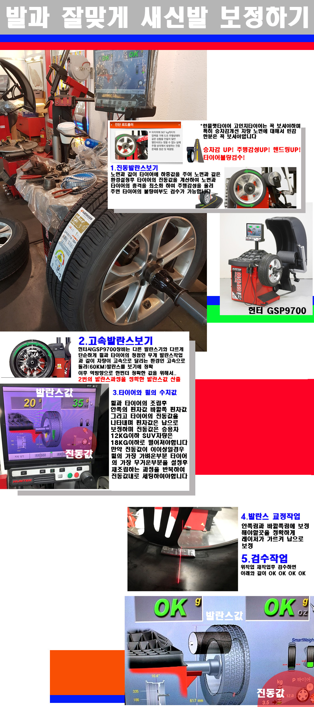 그리고 작업자에게는 불필요한 발란스납을 붙이지 않아 미관상으로 좋고 납을 절약하는 고객님에게도윈이고 작업자에게도 윈윈할수 있는 장비입니다 그리고 시중에서 고속진동발란스라고 말하시는 샵들이 많은데 꼭아셔야하는것은 고속발란스는 말그대로 발란스를 볼때 고속으로 돌리기에 60키로 전후 그리고 진동값을 계산하기위해서는 발란스기에 진동롤러가 있어야합니다 그래서 미국헌터사 GSP9700장비가 유일합니다 다른 샵에서 말하는 발란스기는 고속진동발란스기능없는 일반발란스 기기입니다 이점 꼭 아시고 장착하시기를 바랍니다