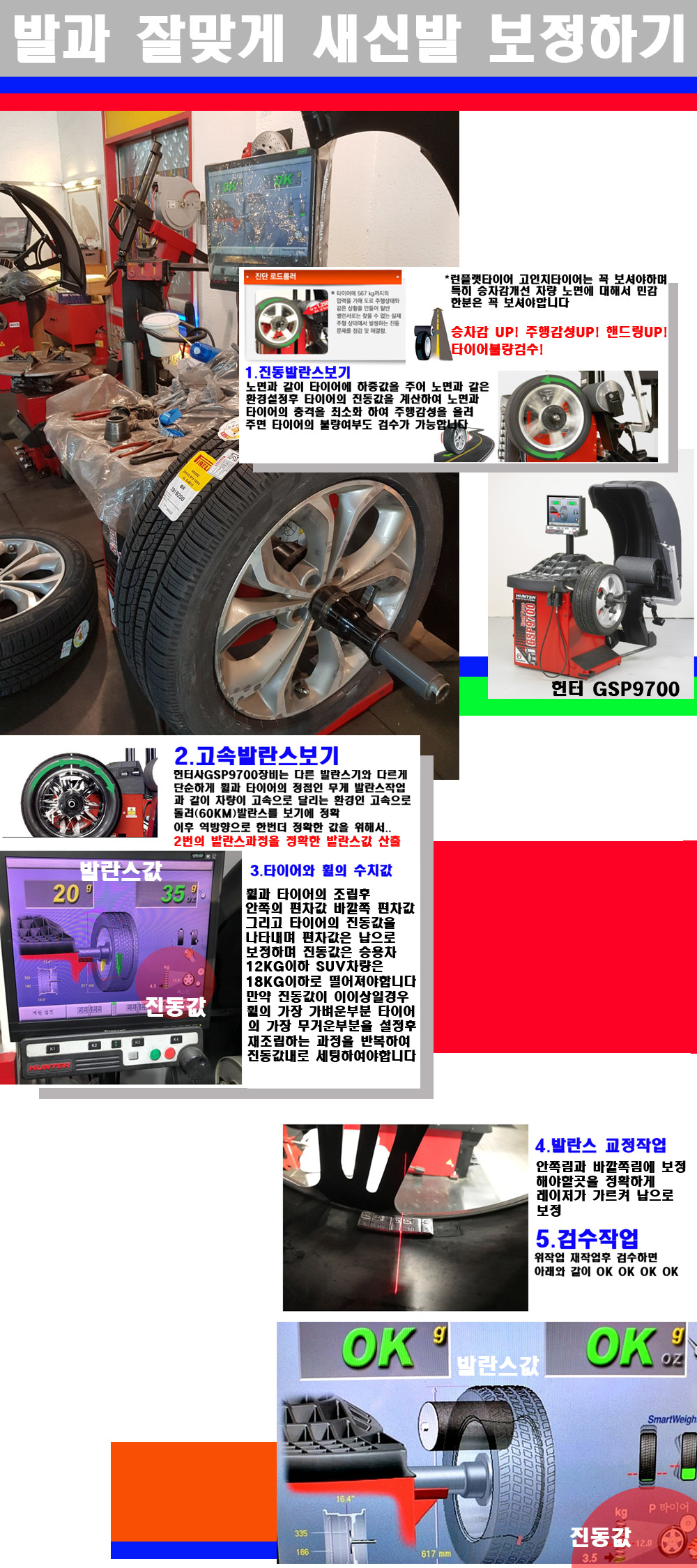 그리고 작업자에게는 불필요한 발란스납을 붙이지 않아 미관상으로 좋고 납을 절약하는 고객님에게도윈이고 작업자에게도 윈윈할수 있는 장비입니다 그리고 시중에서 고속진동발란스라고 말하시는 샵들이 많은데 꼭아셔야하는것은 고속발란스는 말그대로 발란스를 볼때 고속으로 돌리기에 60키로 전후 그리고 진동값을 계산하기위해서는 발란스기에 진동롤러가 있어야합니다 그래서 미국헌터사 GSP9700장비가 유일합니다 다른 샵에서 말하는 발란스기는 고속진동발란스기능없는 일반발란스 기기입니다 이점 꼭 아시고 장착하시기를 바랍니다