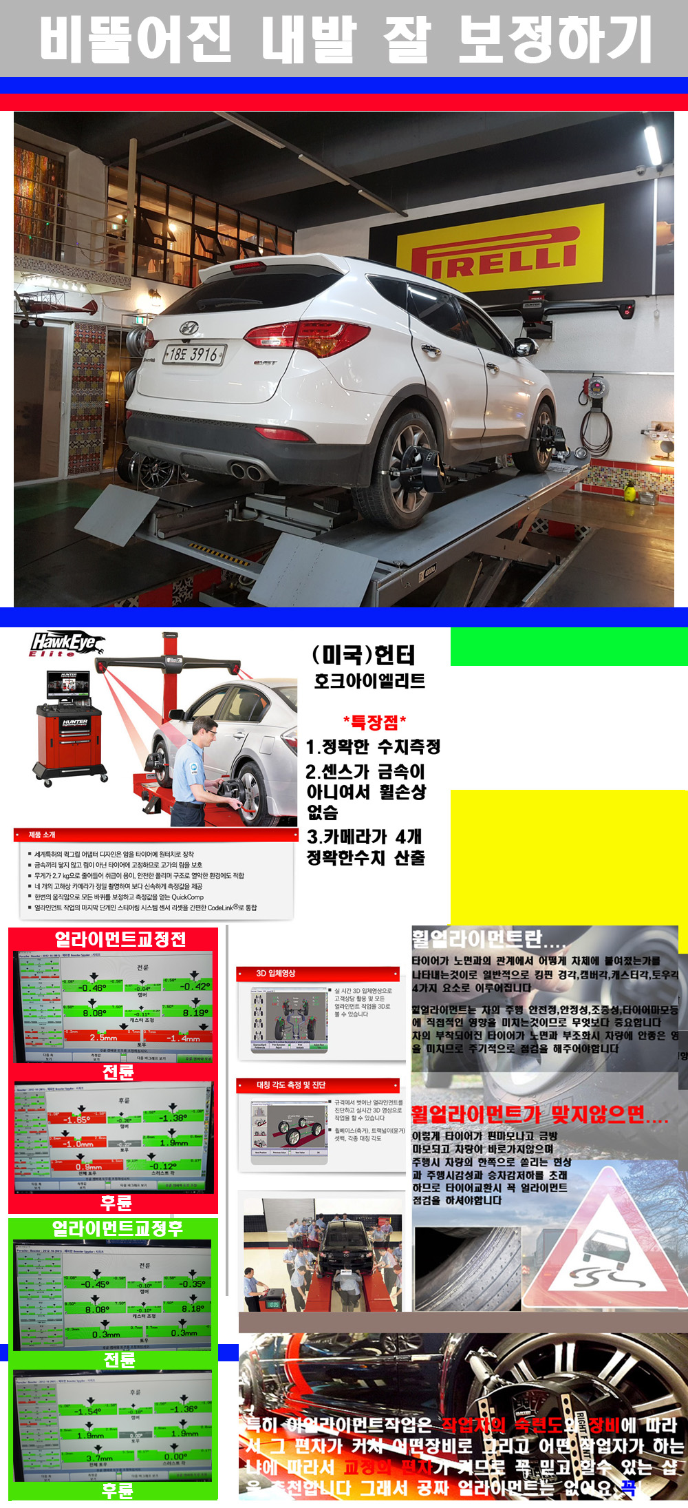 자사는 얼라이먼트정렬시 교정전 교정후를 구분하여 고객님께 직접 이수치값을 확인시켜드리고 작업을 하며 이후 각각의 특성을 가진 타이어들에 대해서 설명 및 관리요령 운전요령 같이 설명해드리고 있습니다