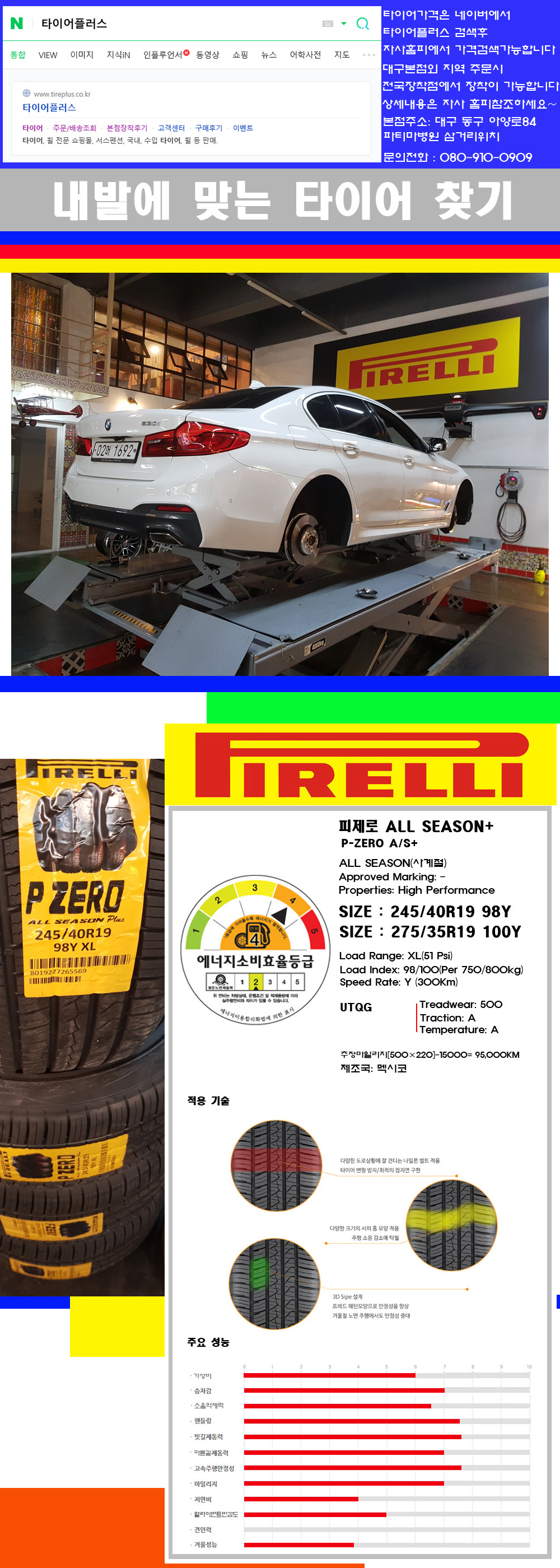 타이어플러스 대구본점은 전국에서 가장 규모가 큰매장입니다 물론 자사는 지하층 지상4층건물이며 1층작업장이외는 모두 창고로 사용중인 회사입니다 대구광역시 동구 아양로84(파티마병원 네거리에 위치) 그래서 매장으로 바로 오시면 당일에 바로 장착이 가능합니다 물론 한국 금호 넥센 브리지스톤 미쉐린 콘티넨탈 피렐리 던롭 굳이어 요코하마 등 세계유수의 10대 브랜드타이어만 취급하고 있습니다 타이어매장중 단일규모로는 아마 전국에서 제일 커지않을까 생각합니다 물론 장비도 현존하는 장비중 가장 최신장비와 그리고 유럽풍 인테리어의 최고급매장입니다 무엇하나 정품만 취급하며 작업또한 꼼꼼하게 매뉴얼에 따라서 작업을 해드립니다 특히 사장님의 이력이 화려한데 레이스로서 경험한 풍부한 자동차의 지식을 갖춘분이십니다 그래서 사장님께서 직접상담해주시고 장착도 해주시는 매장이기에 더 신뢰가 가지 않을까 생각합니다 자사는 인터넷 최저가 기반으로 성장한 회사이기에 가격또한 인터넷 최저가로 장착해 드리고 있습니다 그리고 자사는 고객만족도에서 대상까지 수상한 회사입니다 그래서 한번 저의 매장에서 작업하신 고객님은 아마 다른곳에서는 아마 눈에 차지 않을것이라 생각합니다 가격이면 가격 작업의 원성도면 원성도 그리고 사후 관리까지 최고중에 최고가 되기위해서 노력하는 매장입니다 지금까지 어느 매장에서도 느끼지 못한 감성들을 느끼시기를 바랍니다 감사합니다 피렐리타이어에 대해서 생소하시죠 이회사는 전세계 시장점유율4위정도하는 프리미엄타이어를 전문적으로 생산공급하며 주로 신차용 순정품타이어를 공급하는 고급타이어를 위주로 생산하는 회사입니다 참고로 승용차용 패턴은 피제로타이어와 P7타이어가 있습니다 물론 여름용타이어입니다 그리고 이여름용타이어는 100%가 수입차량의 순정품타이어로 장착됩니다 그리고 타이어성상에 따라서 런플랫타이어와 일반타이어 스폰지타이어 씰타이어이렇게 공급이 되며 그리고 이후 RE용시장용으로 올시즌타이어가 공급이 되고 있습니다 그리고 위의 제품의 원산지는 멕시코이며 사계절용타이어이지만 소음억제력과 특히 승차감과 차량의 퍼포먼스능력을 극대화 시켜놓은 타이어입니다 아마 현존하는 사계절용타이어중 퍼포먼스능력이 제일 좋은 제품이 아닐까 생각합니다 이미 이회사의 상품에대한 우수성이나 신뢰도는 언급을 하지 않으셔도 어느정도의 제품밸류를 가진 회사인것도 아실것 같습니다 고급타이어를 선호하시는 고객님께 추천하는 브랜드입니다 제품의 우수성과 밸류그리고 성능까지 갖춘 제품들로 라인업이 되어져 있는 브랜드입니다 감사합니다