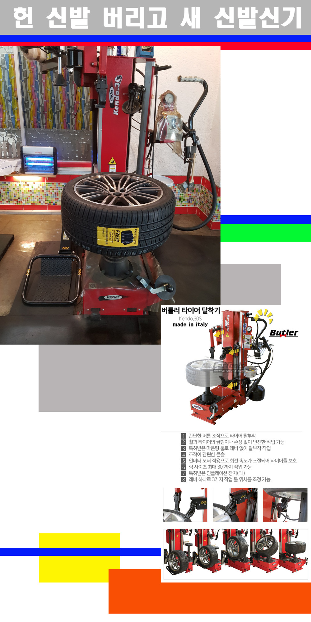 이태리 버틀러사의 켄도3.0S는 휠과 타이어와 조립과 분리시 전혀 제품에 손상을 주지않는 탈착기로 특히 센터락방식(중앙에서 휠를 고정하는 방식)이여서 휠의 중앙부위 잡아서 타이어를 탈부착하고 이후 상하롤러로 타이어를 탈부착합니다 특히 유니포미티작업(휠의 가장가벼운부분과 타이어의 가장 무거운부분을 매칭시키는 작업)시 작업자가 타이어를 정확한 지점에 휠과 매칭시킬수 있는 장점도 있습니다