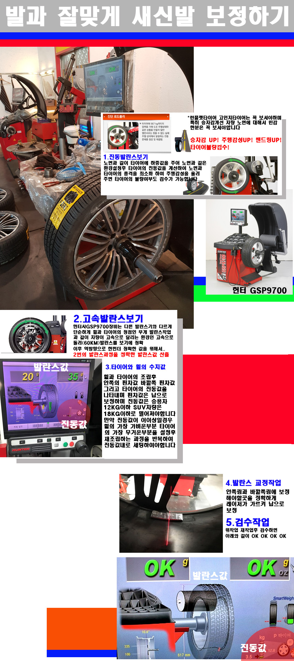 그리고 작업자에게는 불필요한 발란스납을 붙이지 않아 미관상으로 좋고 납을 절약하는 고객님에게도윈이고 작업자에게도 윈윈할수 있는 장비입니다 그리고 시중에서 고속진동발란스라고 말하시는 샵들이 많은데 꼭아셔야하는것은 고속발란스는 말그대로 발란스를 볼때 고속으로 돌리기에 60키로 전후 그리고 진동값을 계산하기위해서는 발란스기에 진동롤러가 있어야합니다 그래서 미국헌터사 GSP9700장비가 유일합니다 다른 샵에서 말하는 발란스기는 고속진동발란스기능없는 일반발란스 기기입니다 이점 꼭 아시고 장착하시기를 바랍니다