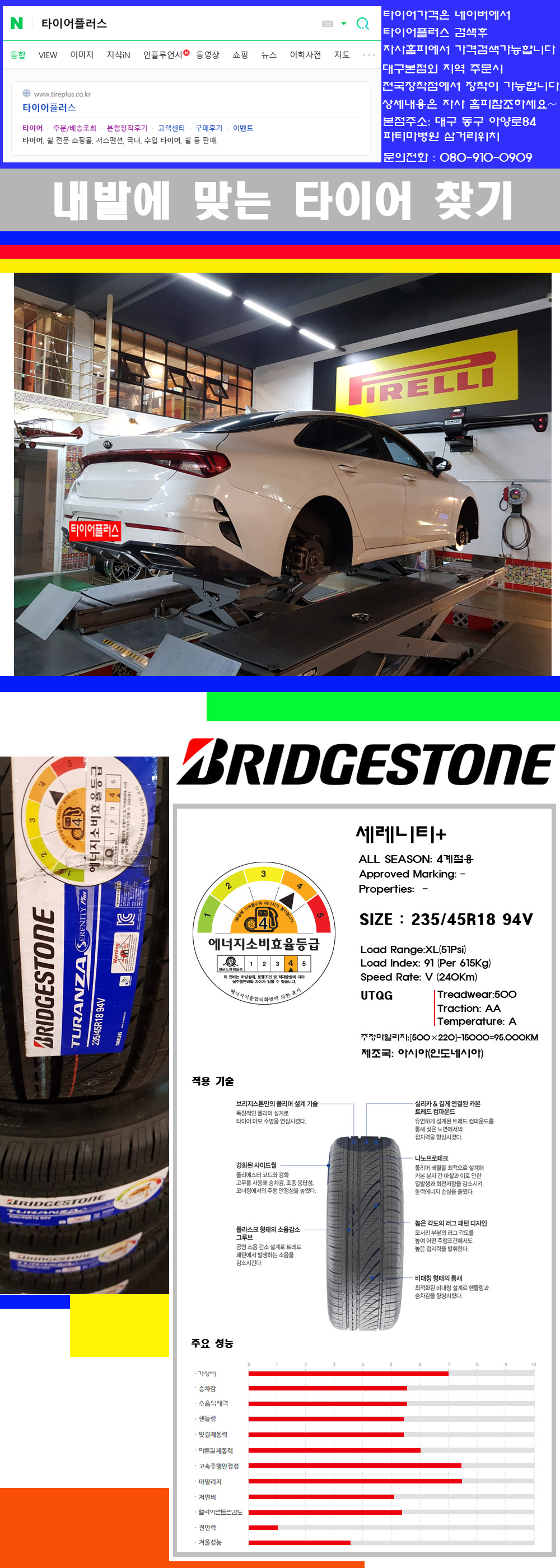 물론 한국 금호 넥센 브리지스톤 미쉐린 콘티넨탈 피렐리 던롭 굳이어 요코하마 등 세계유수의 10대 브랜드타이어만 취급하고 있습니다 타이어매장중 단일규모로는 아마 전국에서 제일 커지않을까 생각합니다 가격도 인터넷 최저가로 장착해 드리고 있습니다 고객님들이 오시면서 너무 고급스러워 가격도 비싸지 않을까 생각하시는데 네이버에서 타이어플러스사이트를 검색해보시면 가격 또한 정말 싸게 판매하고 있구나 하고 생각하실것입니다 물론 장비도 현존하는 장비중 가장 최신장비와 그리고 유럽풍 인테리어의 최고급매장입니다 무엇하나 정품만 취급하며 작업또한 꼼꼼하게 매뉴얼에 따라서 작업을 해드립니다 특히 사장님의 이력이 화려한데 레이스로서 경험한 풍부한 자동차의 지식을 갖춘분이십니다 그래서 사장님께서 직접상담해주시고 장착도 해주시는 매장이기에 더 신뢰가 가지 않을까 생각합니다 자사는 인터넷 최저가 기반으로 성장한 회사이기에 가격또한 인터넷 최저가로 장착해 드리고 있습니다 그리고 자사는 고객만족도에서 대상까지 수상한 회사입니다 그래서 한번 저의 매장에서 작업하신 고객님은 아마 다른곳에서는 아마 눈에 차지 않을것이라 생각합니다 가격이면 가격 작업의 완성도면 완성도 그리고 사후 관리까지 최고중에 최고가 되기위해서 노력하는 매장입니다 지금까지 어느 매장에서도 느끼지 못한 감성들을 느끼시기를 바랍니다 감사합니다 브리지스톤타이어 투란쟈 세레니티+ 이제품은 4계절용타이어로 시판되어지는 가성비가 좋은 수입타이어입니다 그리고 사이즈도 다양하게 출시가 두루두루 장착이 가능한 제품입니다 특히 다른타이어에 비해서 4계절용타이어에 가장 충실한 제품으로 또한 마일리지가 타사제품보다 오래가는 것이 특징입니다