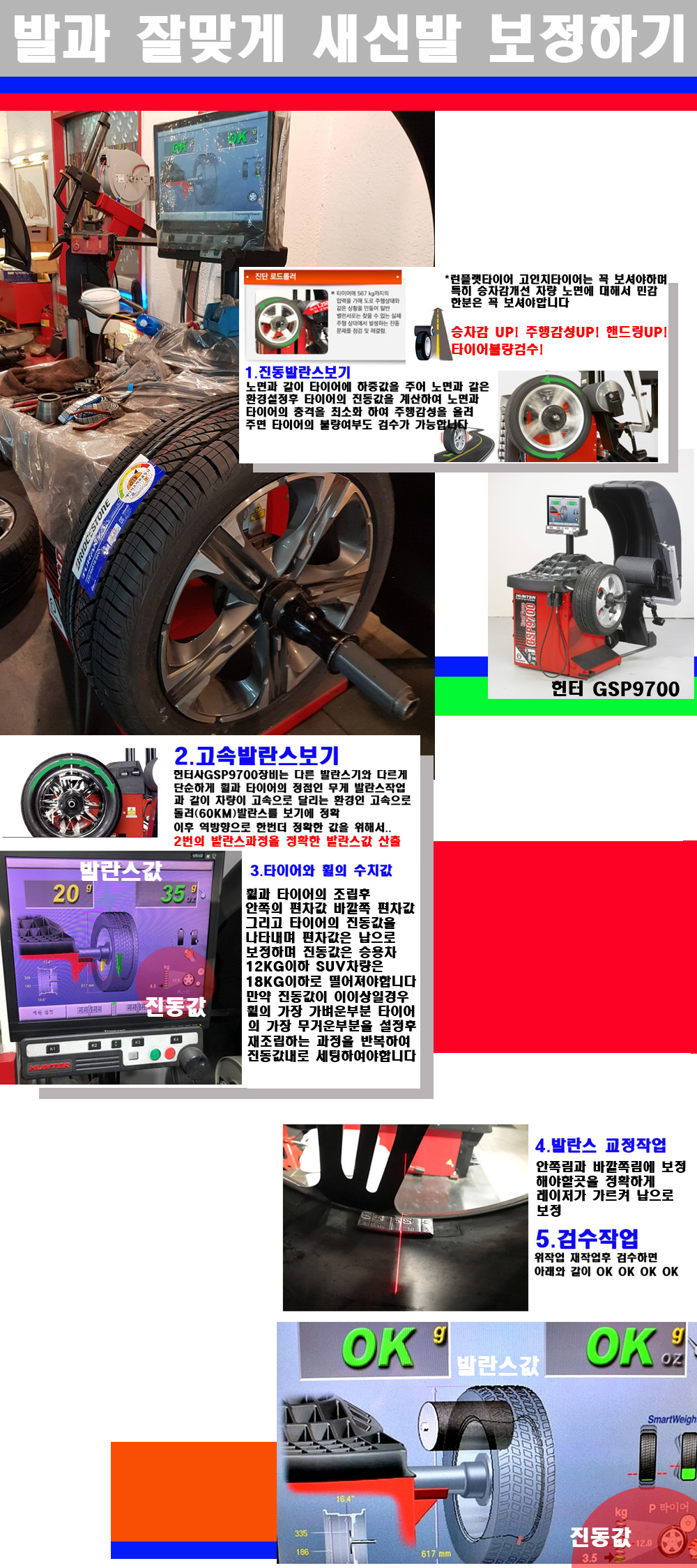 그리고 작업자에게는 불필요한 발란스납을 붙이지 않아 미관상으로 좋고 납을 절약하는 고객님에게도윈이고 작업자에게도 윈윈할수 있는 장비입니다 그리고 시중에서 고속진동발란스라고 말하시는 샵들이 많은데 꼭아셔야하는것은 고속발란스는 말그대로 발란스를 볼때 고속으로 돌리기에 60키로 전후 그리고 진동값을 계산하기위해서는 발란스기에 진동롤러가 있어야합니다 그래서 미국헌터사 GSP9700장비가 유일합니다 다른 샵에서 말하는 발란스기는 고속진동발란스기능없는 일반발란스 기기입니다 이점 꼭 아시고 장착하시기를 바랍니다