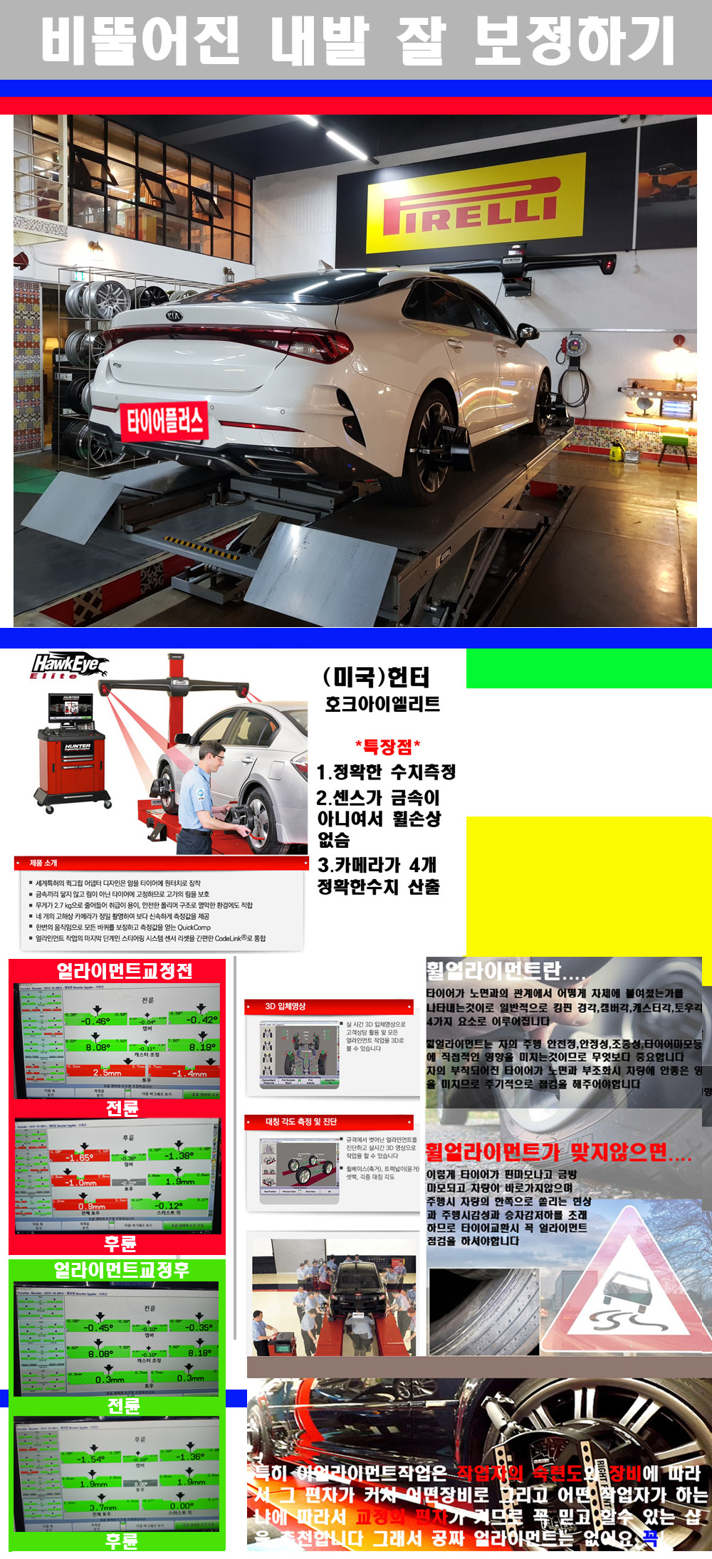자사는 얼라이먼트정렬시 교정전 교정후를 구분하여 고객님께 직접 이수치값을 확인시켜드리고 작업을 하며 이후 각각의 특성을 가진 타이어들에 대해서 설명 및 관리요령 운전요령 같이 설명해드리고 있습니다