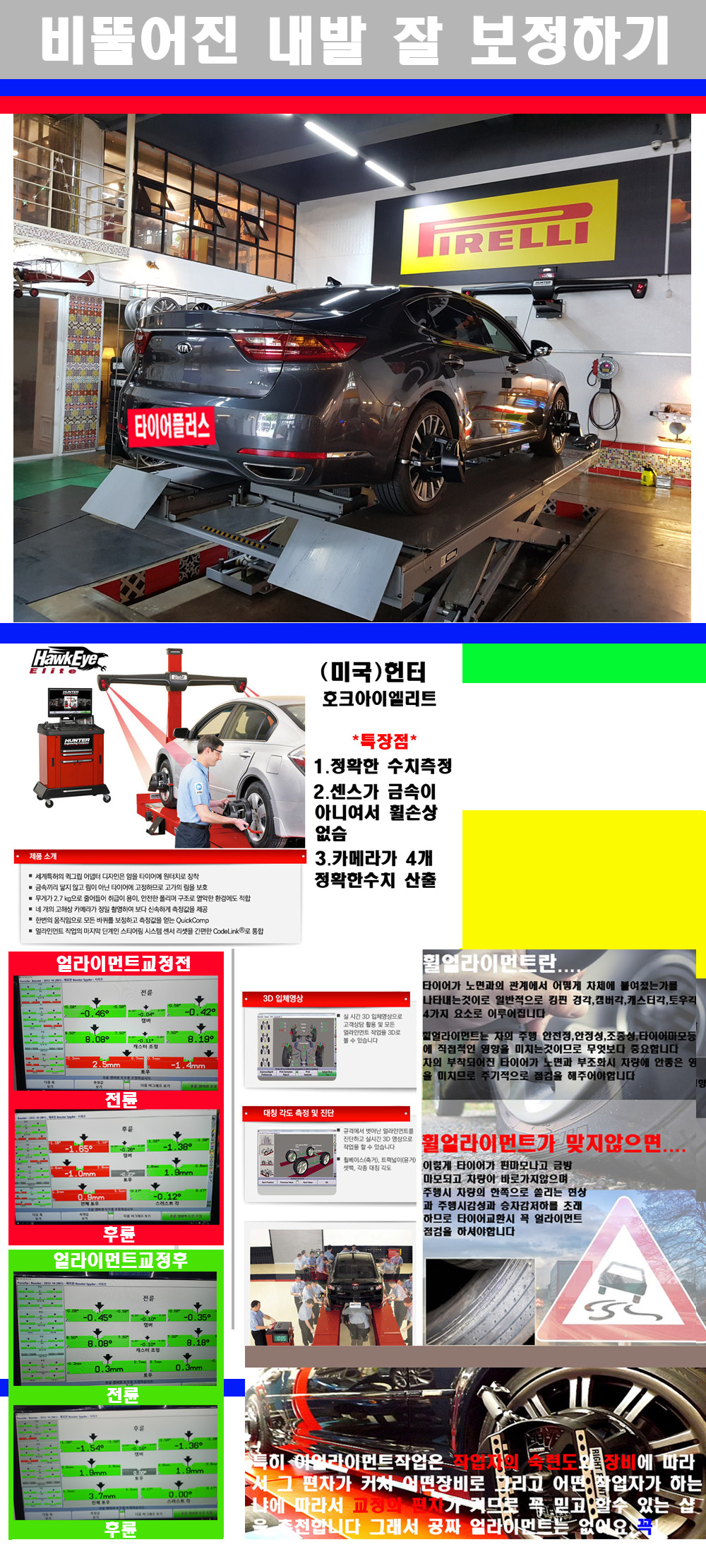 자사는 얼라이먼트정렬시 교정전 교정후를 구분하여 고객님께 직접 이수치값을 확인시켜드리고 작업을 하며 이후 각각의 특성을 가진 타이어들에 대해서 설명 및 관리요령 운전요령 같이 설명해드리고 있습니다