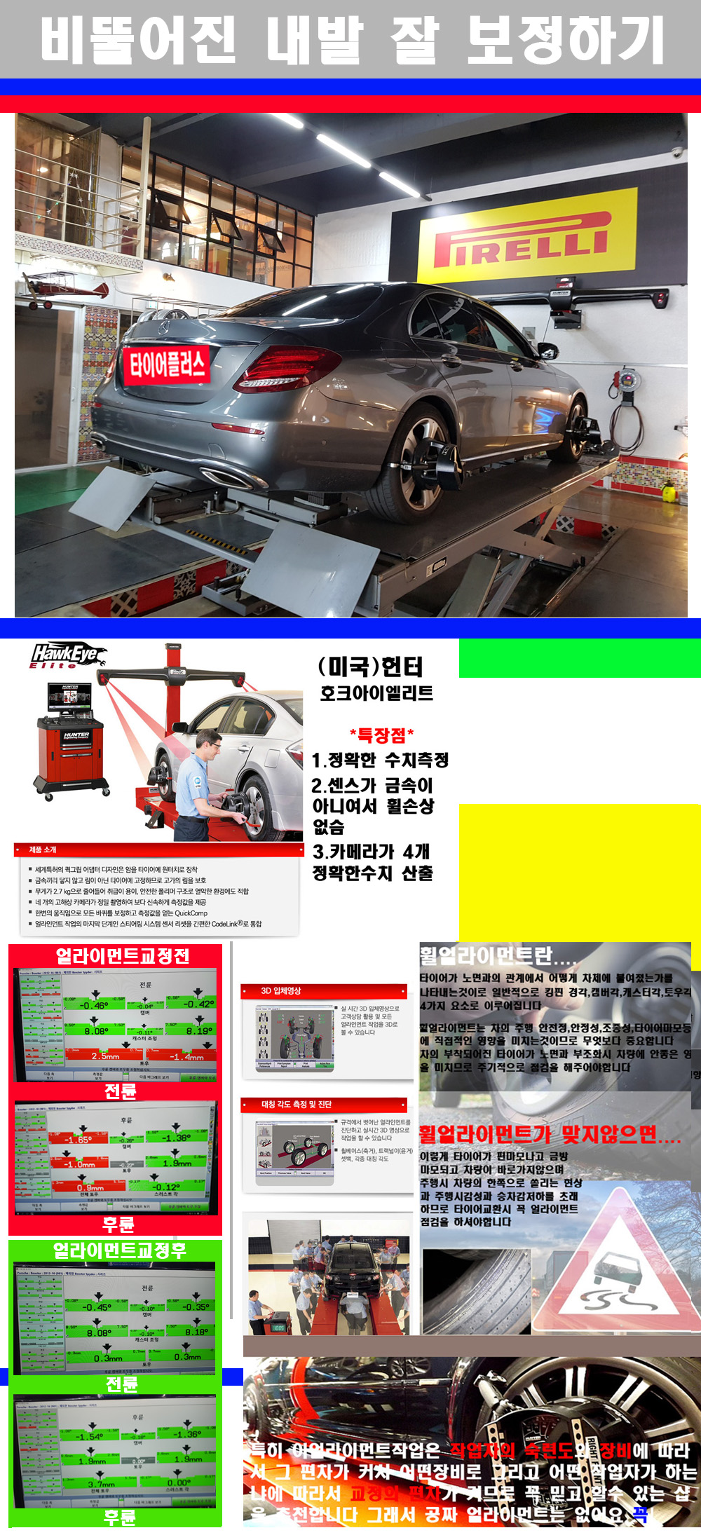 자사는 얼라이먼트정렬시 교정전 교정후를 구분하여 고객님께 직접 이수치값을 확인시켜드리고 작업을 하며 이후 각각의 특성을 가진 타이어들에 대해서 설명 및 관리요령 운전요령 같이 설명해드리고 있습니다