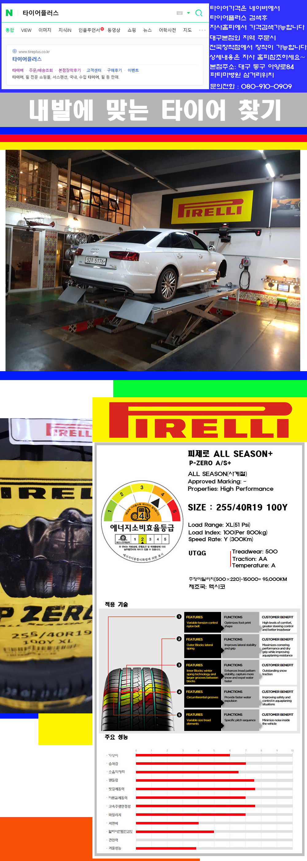 ♥♥♥본점 대구 동구 아양로84 (파티마삼거리 위치) 국산 수입타이어 할인행사중♥♥♥ 타이어플러스 대구본점은 전국에서 가장 규모가 큰매장입니다 물론 자사는 지하층 지상4층건물이며 1층작업장이외는 모두 창고로 사용중인 회사입니다 대구광역시 동구 아양로84(파티마병원 네거리에 위치) 그래서 매장으로 바로 오시면 당일에 바로 장착이 가능합니다 물론 한국 금호 넥센 브리지스톤 미쉐린 콘티넨탈 피렐리 던롭 굳이어 요코하마 등 세계유수의 10대 브랜드타이어만 취급하고 있습니다 타이어매장중 단일규모로는 아마 전국에서 제일 커지않을까 생각합니다 물론 장비도 현존하는 장비중 가장 최신장비와 그리고 유럽풍 인테리어의 최고급매장입니다 무엇하나 정품만 취급하며 작업또한 꼼꼼하게 매뉴얼에 따라서 작업을 해드립니다 특히 사장님의 이력이 화려한데 레이스로서 경험한 풍부한 자동차의 지식을 갖춘분이십니다 그래서 사장님께서 직접상담해주시고 장착도 해주시는 매장이기에 더 신뢰가 가지 않을까 생각합니다 자사는 인터넷 최저가 기반으로 성장한 회사이기에 가격또한 인터넷 최저가로 장착해 드리고 있습니다 그리고 자사는 고객만족도에서 대상까지 수상한 회사입니다 그래서 한번 저의 매장에서 작업하신 고객님은 아마 다른곳에서는 아마 눈에 차지 않을것이라 생각합니다 가격이면 가격 작업의 완성도면 완성도 그리고 사후 관리까지 최고중에 최고가 되기위해서 노력하는 매장입니다 지금까지 어느 매장에서도 느끼지 못한 감성들을 느끼시기를 바랍니다 감사합니다 피렐리타이어에 대해서 생소하시죠 이회사는 전세계 시장점유율4위정도하는 프리미엄타이어를 전문적으로 생산공급하며 주로 신차용 순정품타이어를 공급하는 고급타이어를 위주로 생산하는 회사입니다 참고로 승용차용 패턴은 피제로타이어와 P7타이어가 있습니다 물론 여름용타이어입니다 그리고 이여름용타이어는 100%가 수입차량의 순정품타이어로 장착됩니다 여름용타이어는 여름에만 사용하는 것이 아니라 영상7도씨에서 최상의 성능을 발휘하기에 이렇게 불려지는것입니다 그리고 타이어성상에 따라서 런플랫타이어와 일반타이어 스폰지타이어 씰타이어이렇게 공급이 되며 그리고 이후 RE용시장용으로 올시즌타이어가 공급이 되고 있습니다 그리고 위의 제품의 원산지는 멕시코이며 사계절용타이어이지만 소음억제력과 특히 승차감과 차량의 퍼포먼스능력을 극대화 시켜놓은 타이어입니다 아마 현존하는 사계절용타이어중 퍼포먼스능력이 제일 좋은 제품이 아닐까 생각합니다 이미 이회사의 상품에대한 우수성이나 신뢰도는 언급을 하지 않으셔도 어느정도의 제품밸류를 가진 회사인것도 아실것 같습니다 고급타이어를 선호하시는 고객님께 추천하는 브랜드입니다 제품의 우수성과 밸류그리고 성능까지 갖춘 제품들로 라인업이 되어져 있는 브랜드입니다 감사합니다
