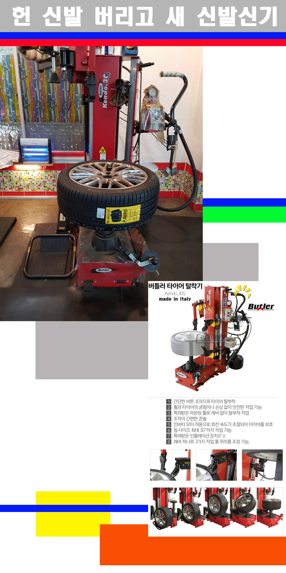 이태리 버틀러사의 켄도3.0S는 휠과 타이어와 조립과 분리시 전혀 제품에 손상을 주지않는 탈착기로 특히 센터락방식이여서 휠의 중앙부위 잡아서 타이어를 탈부착하고 이후 상하롤러로 타이어를 탈부착합니다 특히 유니포미티작업(휠의 가장가벼운부분과 타이어의 가장 무거운부분을 매칭시키는 작업)시 작업자가 타이어를 정확한 지점에 휠과 매칭시킬수 있는 장점도 있습니다
