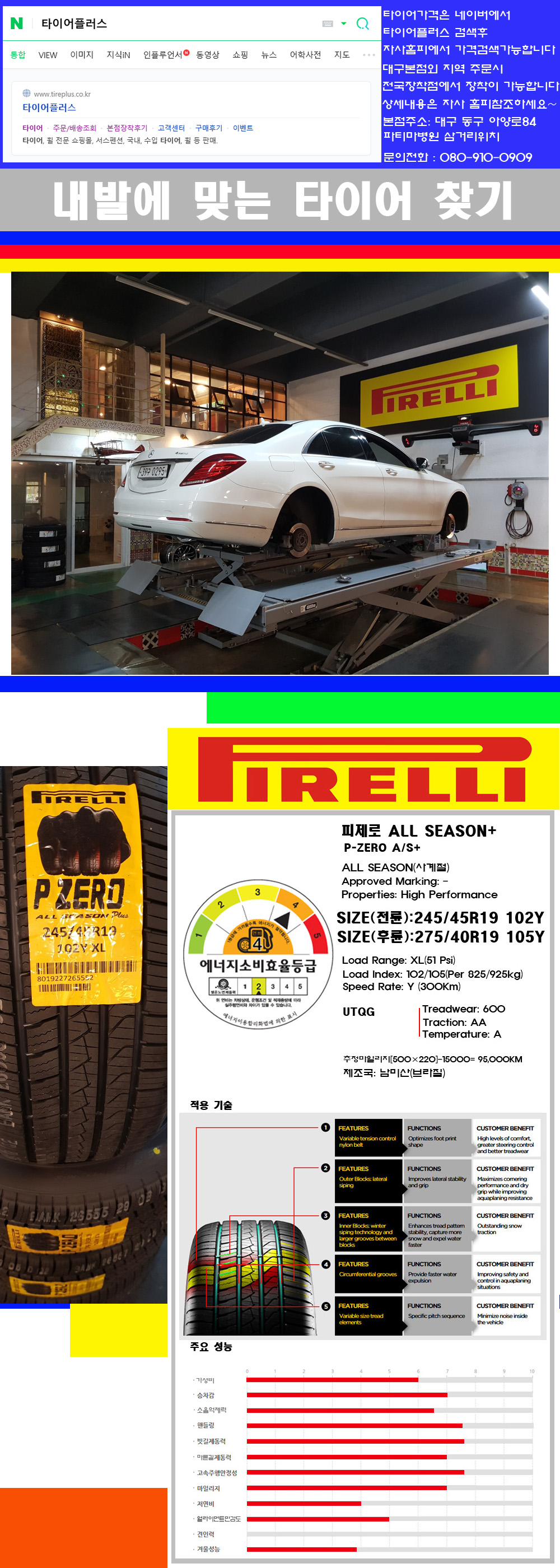 ♥♥♥본점 대구 동구 아양로84 (파티마삼거리 위치) 국산 수입타이어 할인행사중♥♥♥ 타이어플러스 대구본점은 전국에서 가장 규모가 큰매장입니다 물론 자사는 지하층 지상4층건물이며 1층작업장이외는 모두 창고로 사용중인 회사입니다 대구광역시 동구 아양로84(파티마병원 네거리에 위치) 그래서 매장으로 바로 오시면 당일에 바로 장착이 가능합니다 물론 한국 금호 넥센 브리지스톤 미쉐린 콘티넨탈 피렐리 던롭 굳이어 요코하마 등 세계유수의 10대 브랜드타이어만 취급하고 있습니다 타이어매장중 단일규모로는 아마 전국에서 제일 커지않을까 생각합니다 물론 장비도 현존하는 장비중 가장 최신장비와 그리고 유럽풍 인테리어의 최고급매장입니다 무엇하나 정품만 취급하며 작업또한 꼼꼼하게 매뉴얼에 따라서 작업을 해드립니다 특히 사장님의 이력이 화려한데 레이스로서 경험한 풍부한 자동차의 지식을 갖춘분이십니다 그래서 사장님께서 직접상담해주시고 장착도 해주시는 매장이기에 더 신뢰가 가지 않을까 생각합니다 자사는 인터넷 최저가 기반으로 성장한 회사이기에 가격또한 인터넷 최저가로 장착해 드리고 있습니다 그리고 자사는 고객만족도에서 대상까지 수상한 회사입니다 그래서 한번 저의 매장에서 작업하신 고객님은 아마 다른곳에서는 아마 눈에 차지 않을것이라 생각합니다 가격이면 가격 작업의 완성도면 완성도 그리고 사후 관리까지 최고중에 최고가 되기위해서 노력하는 매장입니다 지금까지 어느 매장에서도 느끼지 못한 감성들을 느끼시기를 바랍니다 감사합니다 피렐리타이어에 대해서 생소하시죠 이회사는 전세계 시장점유율4위정도하는 프리미엄타이어를 전문적으로 생산공급하며 주로 신차용 순정품타이어를 공급하는 고급타이어를 위주로 생산하는 회사입니다 참고로 승용차용 패턴은 피제로타이어와 P7타이어가 있습니다 물론 여름용타이어입니다 그리고 이여름용타이어는 100%가 수입차량의 순정품타이어로 장착됩니다 여름용타이어는 여름에만 사용하는 것이 아니라 영상7도씨에서 최상의 성능을 발휘하기에 이렇게 불려지는것입니다 그리고 타이어성상에 따라서 런플랫타이어와 일반타이어 스폰지타이어 씰타이어이렇게 공급이 되며 그리고 이후 RE용시장용으로 올시즌타이어가 공급이 되고 있습니다 그리고 위의 제품의 원산지는 멕시코이며 사계절용타이어이지만 소음억제력과 특히 승차감과 차량의 퍼포먼스능력을 극대화 시켜놓은 타이어입니다 아마 현존하는 사계절용타이어중 퍼포먼스능력이 제일 좋은 제품이 아닐까 생각합니다 이미 이회사의 상품에대한 우수성이나 신뢰도는 언급을 하지 않으셔도 어느정도의 제품밸류를 가진 회사인것도 아실것 같습니다 고급타이어를 선호하시는 고객님께 추천하는 브랜드입니다 제품의 우수성과 밸류그리고 성능까지 갖춘 제품들로 라인업이 되어져 있는 브랜드입니다 감사합니다
