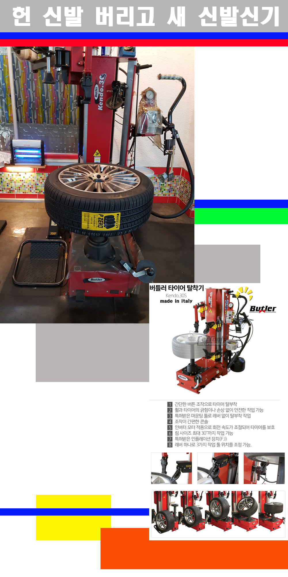 이태리 버틀러사의 켄도3.0S는 휠과 타이어와 조립과 분리시 전혀 제품에 손상을 주지않는 탈착기로 특히 센터락방식이여서 휠의 중앙부위 잡아서 타이어를 탈부착하고 이후 상하롤러로 타이어를 탈부착합니다 특히 유니포미티작업(휠의 가장가벼운부분과 타이어의 가장 무거운부분을 매칭시키는 작업)시 작업자가 타이어를 정확한 지점에 휠과 매칭시킬수 있는 장점도 있습니다