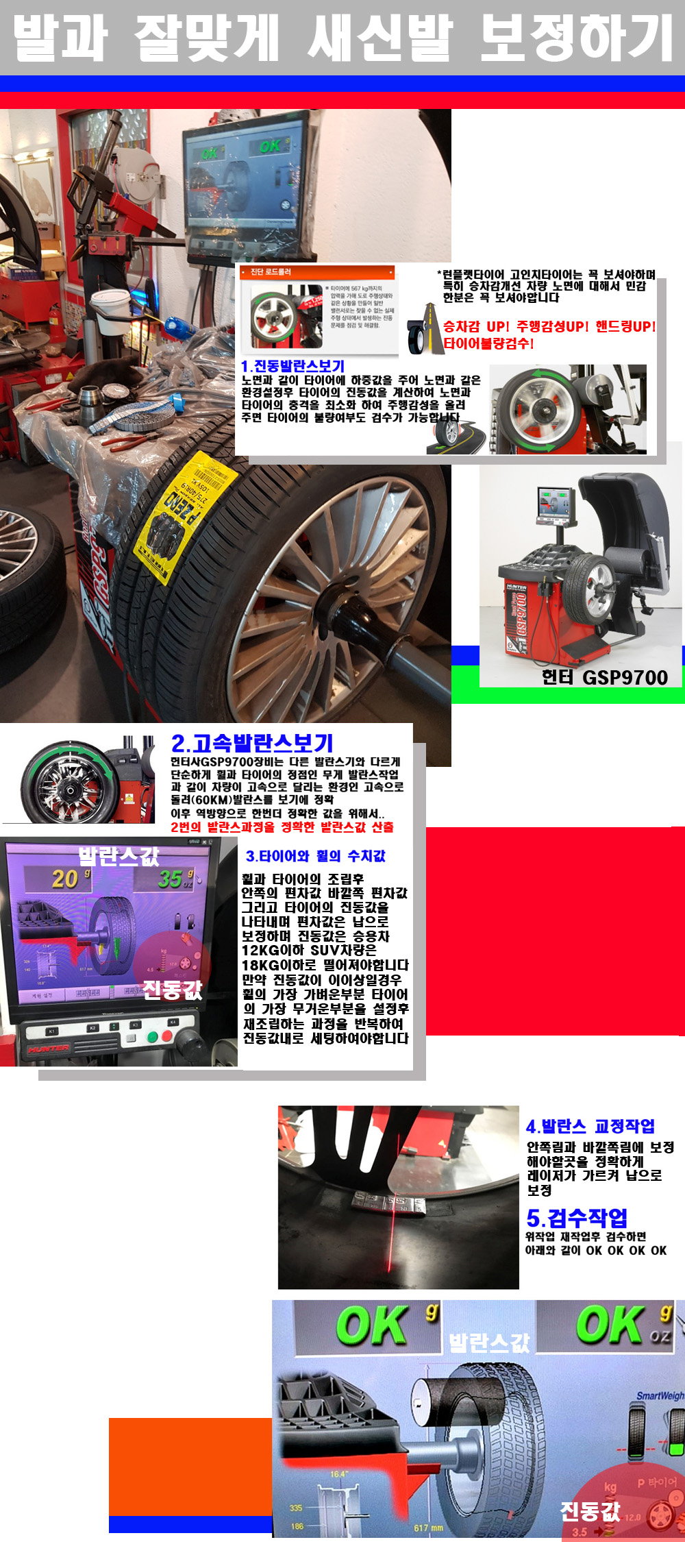 그리고 작업자에게는 불필요한 발란스납을 붙이지 않아 미관상으로 좋고 납을 절약하는 고객님에게도윈이고 작업자에게도 윈윈할수 있는 장비입니다 그리고 시중에서 고속진동발란스라고 말하시는 샵들이 많은데 꼭아셔야하는것은 고속발란스는 말그대로 발란스를 볼때 고속으로 돌리기에 60키로 전후 그리고 진동값을 계산하기위해서는 발란스기에 진동롤러가 있어야합니다 그래서 미국헌터사 GSP9700장비가 유일합니다 다른 샵에서 말하는 발란스기는 고속진동발란스기능없는 일반발란스 기기입니다 이점 꼭 아시고 장착하시기를 바랍니다