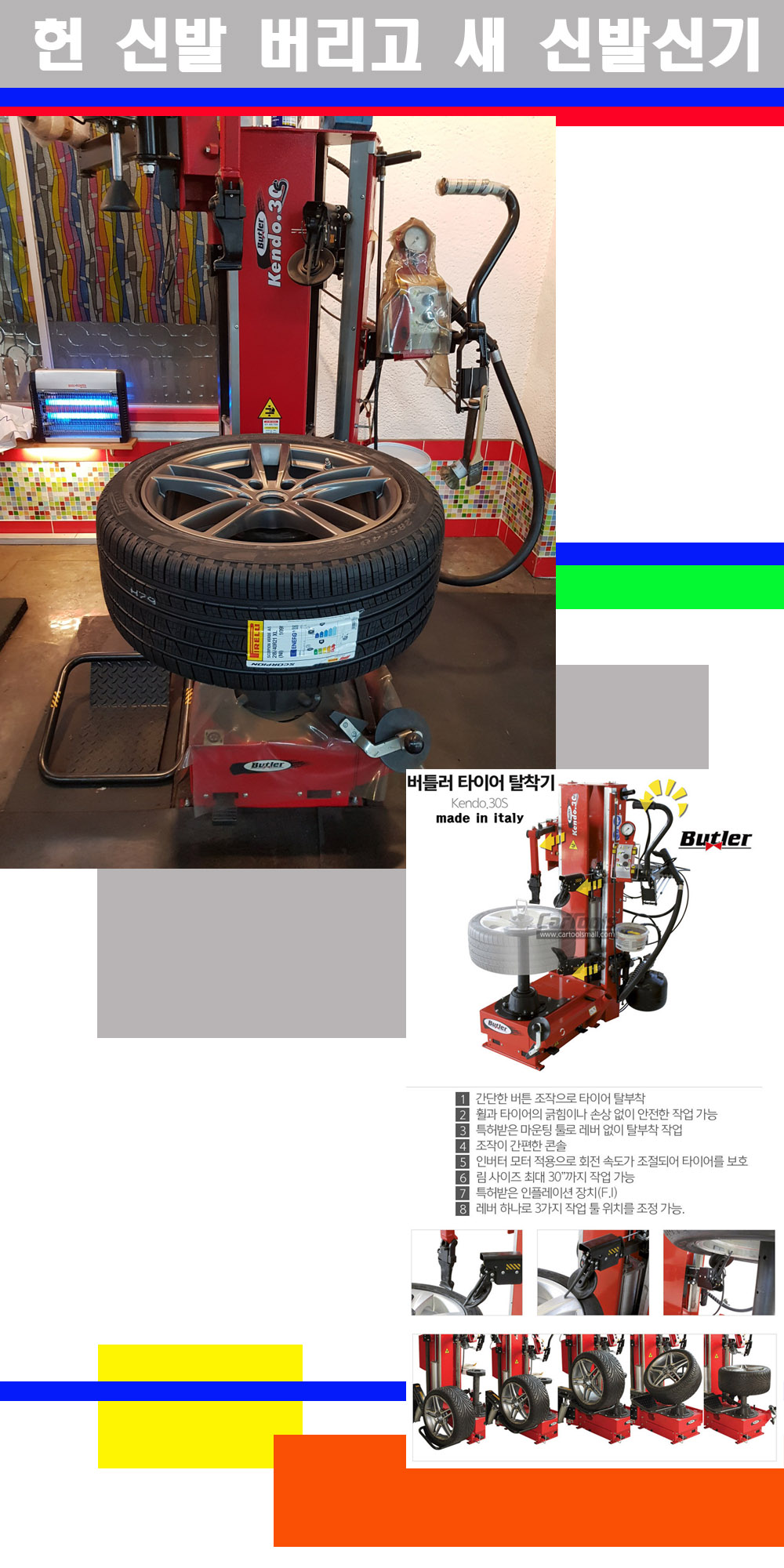 이태리 버틀러사의 켄도3.0S는 휠과 타이어와 조립과 분리시 전혀 제품에 손상을 주지않는 탈착기로 특히 센터락방식(중앙에서 휠를 고정하는 방식)이여서 휠의 중앙부위 잡아서 타이어를 탈부착하고 이후 상하롤러로 타이어를 탈부착합니다 특히 유니포미티작업(휠의 가장가벼운부분과 타이어의 가장 무거운부분을 매칭시키는 작업)시 작업자가 타이어를 정확한 지점에 휠과 매칭시킬수 있는 장점도 있습니다