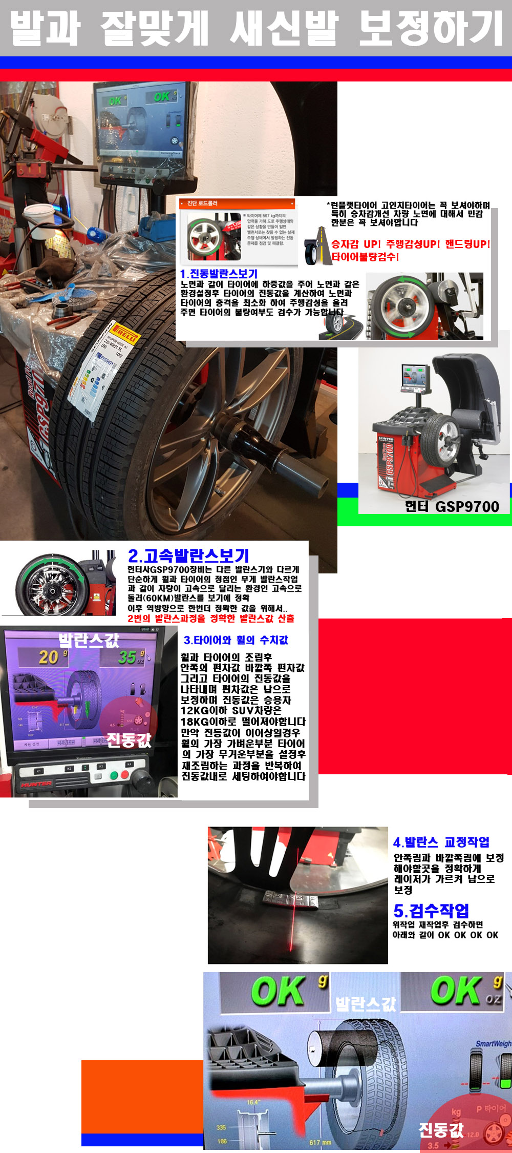 그리고 작업자에게는 불필요한 발란스납을 붙이지 않아 미관상으로 좋고 납을 절약하는 고객님에게도윈이고 작업자에게도 윈윈할수 있는 장비입니다 그리고 시중에서 고속진동발란스라고 말하시는 샵들이 많은데 꼭아셔야하는것은 고속발란스는 말그대로 발란스를 볼때 고속으로 돌리기에 60키로 전후 그리고 진동값을 계산하기위해서는 발란스기에 진동롤러가 있어야합니다 그래서 미국헌터사 GSP9700장비가 유일합니다 다른 샵에서 말하는 발란스기는 고속진동발란스기능없는 일반발란스 기기입니다 이점 꼭 아시고 장착하시기를 바랍니다