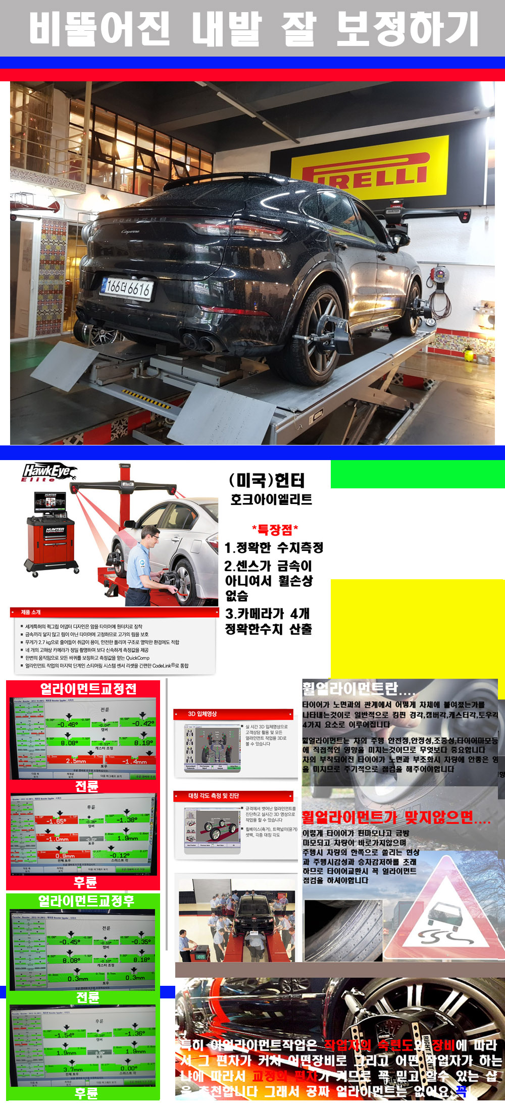 자사는 얼라이먼트정렬시 교정전 교정후를 구분하여 고객님께 직접 이수치값을 확인시켜드리고 작업을 하며 이후 각각의 특성을 가진 타이어들에 대해서 설명 및 관리요령 운전요령 같이 설명해드리고 있습니다