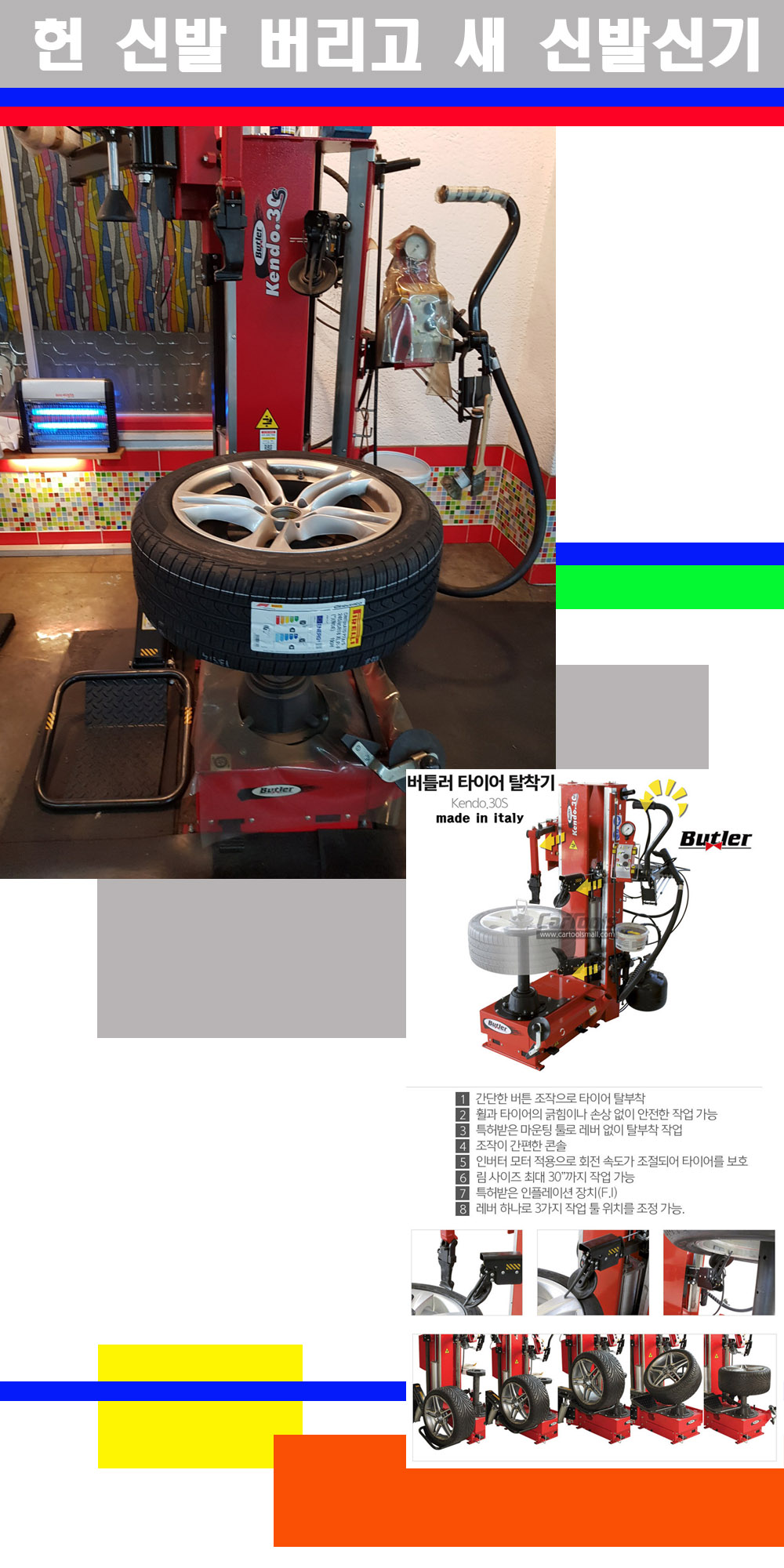 이태리 버틀러사의 켄도3.0S는 휠과 타이어와 조립과 분리시 전혀 제품에 손상을 주지않는 탈착기로 특히 센터락방식(중앙에서 휠를 고정하는 방식)이여서 휠의 중앙부위 잡아서 타이어를 탈부착하고 이후 상하롤러로 타이어를 탈부착합니다 특히 유니포미티작업(휠의 가장가벼운부분과 타이어의 가장 무거운부분을 매칭시키는 작업)시 작업자가 타이어를 정확한 지점에 휠과 매칭시킬수 있는 장점도 있습니다