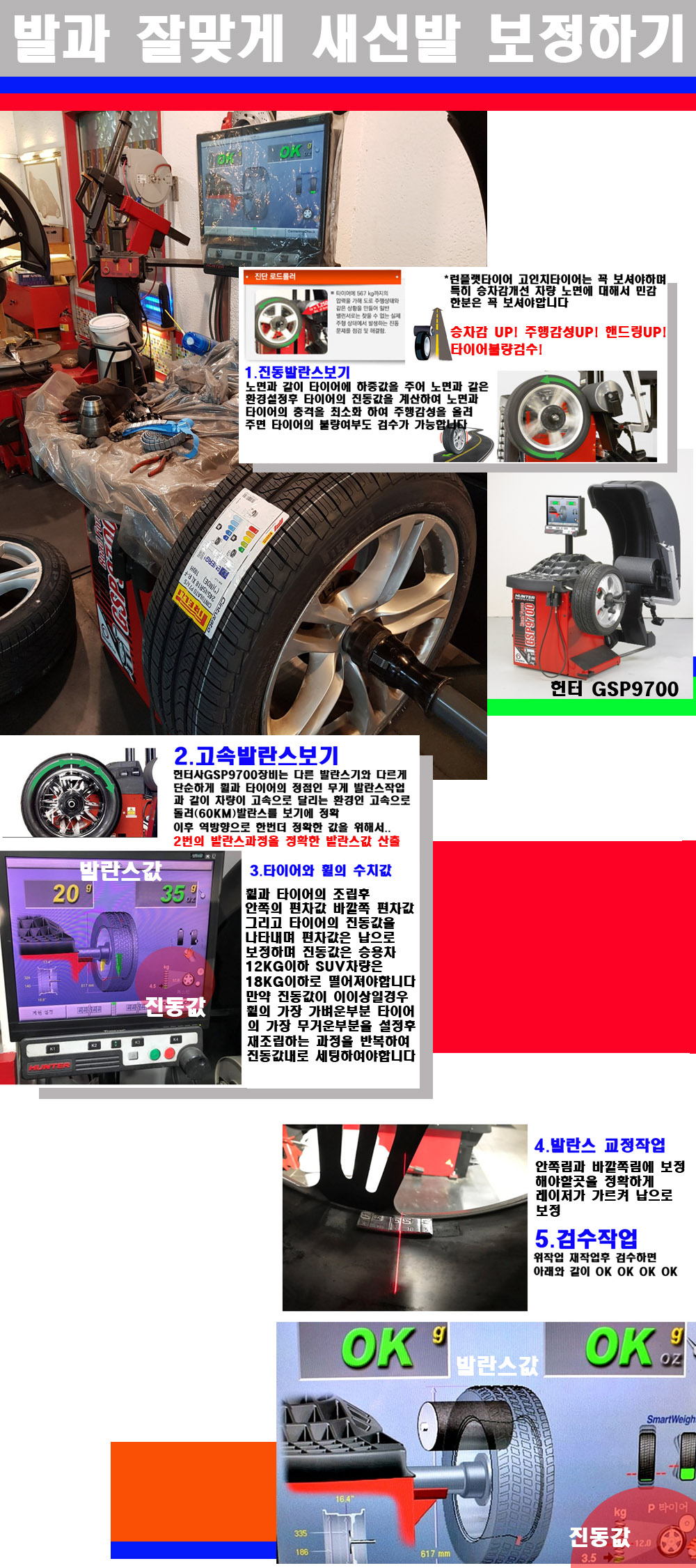 그리고 작업자에게는 불필요한 발란스납을 붙이지 않아 미관상으로 좋고 납을 절약하는 고객님에게도윈이고 작업자에게도 윈윈할수 있는 장비입니다 그리고 시중에서 고속진동발란스라고 말하시는 샵들이 많은데 꼭아셔야하는것은 고속발란스는 말그대로 발란스를 볼때 고속으로 돌리기에 60키로 전후 그리고 진동값을 계산하기위해서는 발란스기에 진동롤러가 있어야합니다 그래서 미국헌터사 GSP9700장비가 유일합니다 다른 샵에서 말하는 발란스기는 고속진동발란스기능없는 일반발란스 기기입니다 이점 꼭 아시고 장착하시기를 바랍니다