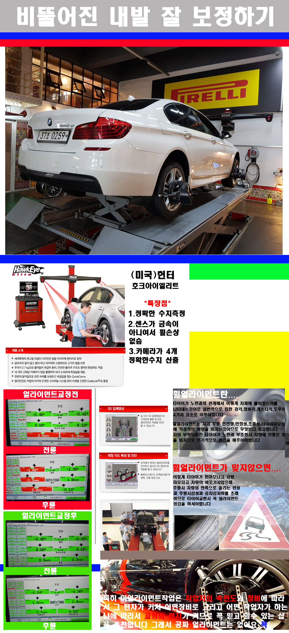 자사는 얼라이먼트정렬시 교정전 교정후를 구분하여 고객님께 직접 이수치값을 확인시켜드리고 작업을 하며 이후 각각의 특성을 가진 타이어들에 대해서 설명 및 관리요령 운전요령 같이 설명해드리고 있습니다