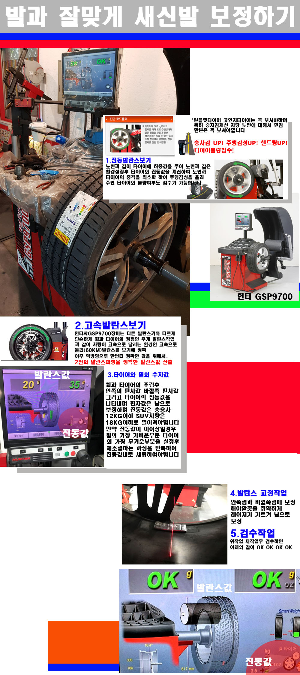 그리고 작업자에게는 불필요한 발란스납을 붙이지 않아 미관상으로 좋고 납을 절약하는 고객님에게도윈이고 작업자에게도 윈윈할수 있는 장비입니다 그리고 시중에서 고속진동발란스라고 말하시는 샵들이 많은데 꼭아셔야하는것은 고속발란스는 말그대로 발란스를 볼때 고속으로 돌리기에 60키로 전후 그리고 진동값을 계산하기위해서는 발란스기에 진동롤러가 있어야합니다 그래서 미국헌터사 GSP9700장비가 유일합니다 다른 샵에서 말하는 발란스기는 고속진동발란스기능없는 일반발란스 기기입니다 이점 꼭 아시고 장착하시기를 바랍니다