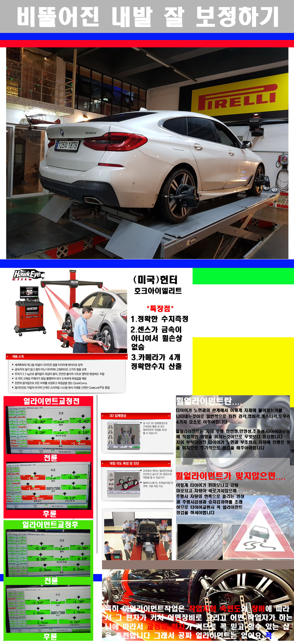 자사는 얼라이먼트정렬시 교정전 교정후를 구분하여 고객님께 직접 이수치값을 확인시켜드리고 작업을 하며 이후 각각의 특성을 가진 타이어들에 대해서 설명 및 관리요령 운전요령 같이 설명해드리고 있습니다