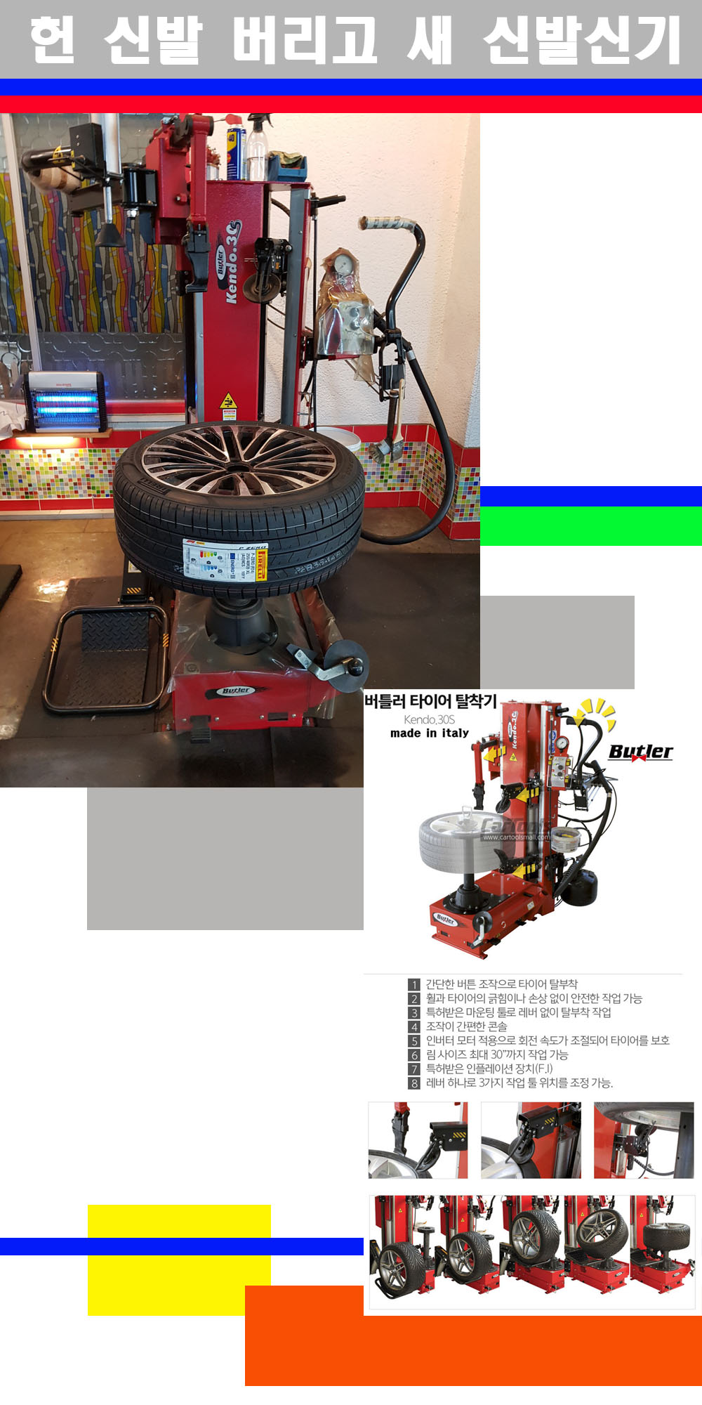 이태리 버틀러사의 켄도3.0S는 휠과 타이어와 조립과 분리시 전혀 제품에 손상을 주지않는 탈착기로 특히 센터락방식(중앙에서 휠를 고정하는 방식)이여서 휠의 중앙부위 잡아서 타이어를 탈부착하고 이후 상하롤러로 타이어를 탈부착합니다 특히 유니포미티작업(휠의 가장가벼운부분과 타이어의 가장 무거운부분을 매칭시키는 작업)시 작업자가 타이어를 정확한 지점에 휠과 매칭시킬수 있는 장점도 있습니다