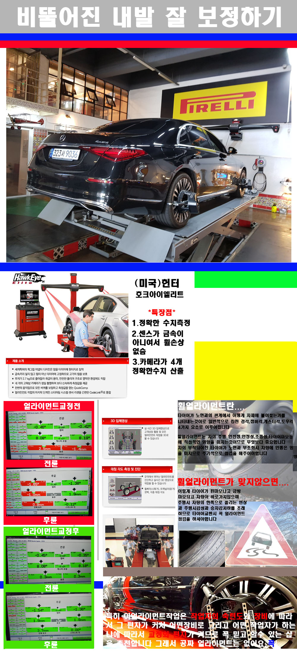 자사는 얼라이먼트정렬시 교정전 교정후를 구분하여 고객님께 직접 이수치값을 확인시켜드리고 작업을 하며 이후 각각의 특성을 가진 타이어들에 대해서 설명 및 관리요령 운전요령 같이 설명해드리고 있습니다