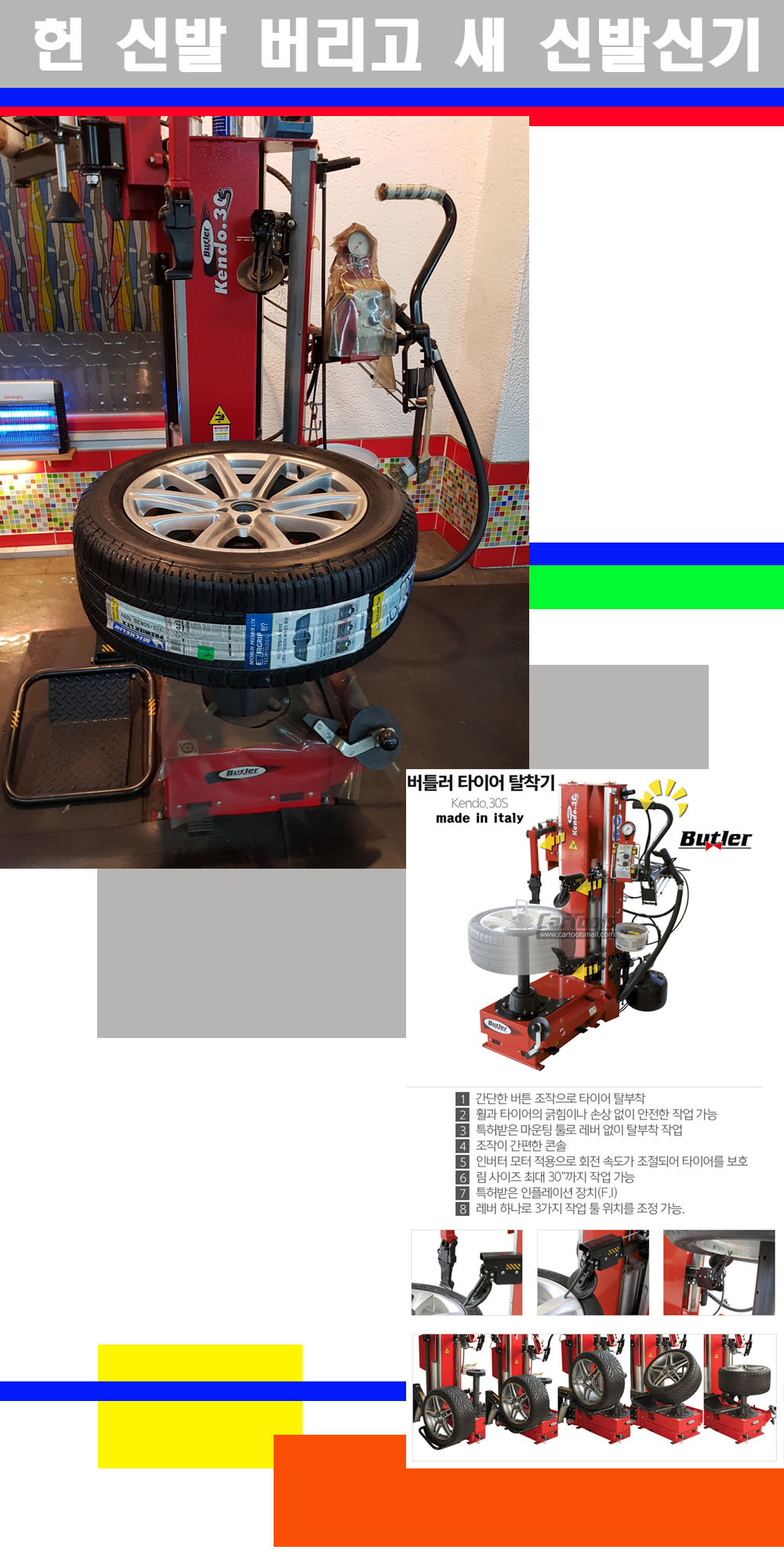 이태리 버틀러사의 켄도3.0S는 휠과 타이어와 조립과 분리시 전혀 제품에 손상을 주지않는 탈착기로 특히 센터락방식(중앙에서 휠를 고정하는 방식)이여서 휠의 중앙부위 잡아서 타이어를 탈부착하고 이후 상하롤러로 타이어를 탈부착합니다 특히 유니포미티작업(휠의 가장가벼운부분과 타이어의 가장 무거운부분을 매칭시키는 작업)시 작업자가 타이어를 정확한 지점에 휠과 매칭시킬수 있는 장점도 있습니다