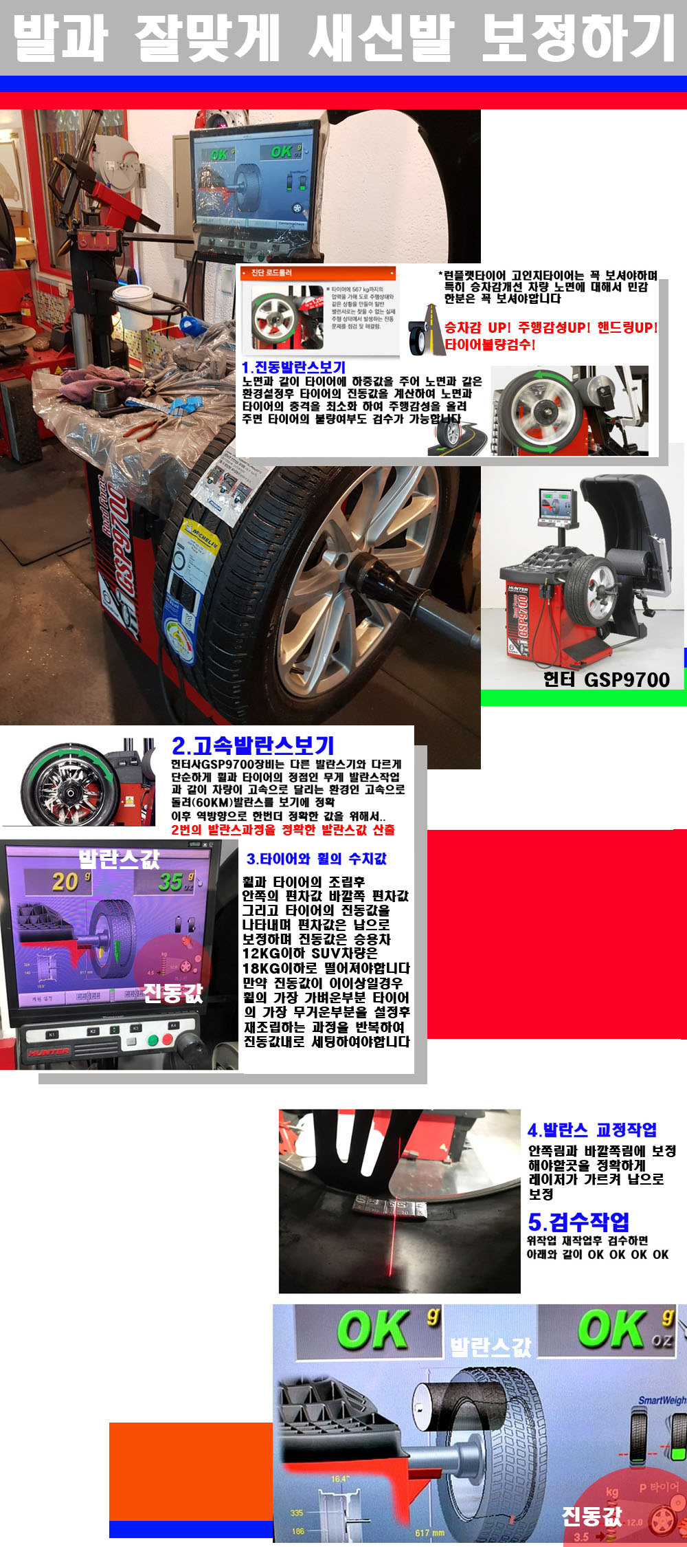 그리고 작업자에게는 불필요한 발란스납을 붙이지 않아 미관상으로 좋고 납을 절약하는 고객님에게도윈이고 작업자에게도 윈윈할수 있는 장비입니다 그리고 시중에서 고속진동발란스라고 말하시는 샵들이 많은데 꼭아셔야하는것은 고속발란스는 말그대로 발란스를 볼때 고속으로 돌리기에 60키로 전후 그리고 진동값을 계산하기위해서는 발란스기에 진동롤러가 있어야합니다 그래서 미국헌터사 GSP9700장비가 유일합니다 다른 샵에서 말하는 발란스기는 고속진동발란스기능없는 일반발란스 기기입니다 이점 꼭 아시고 장착하시기를 바랍니다