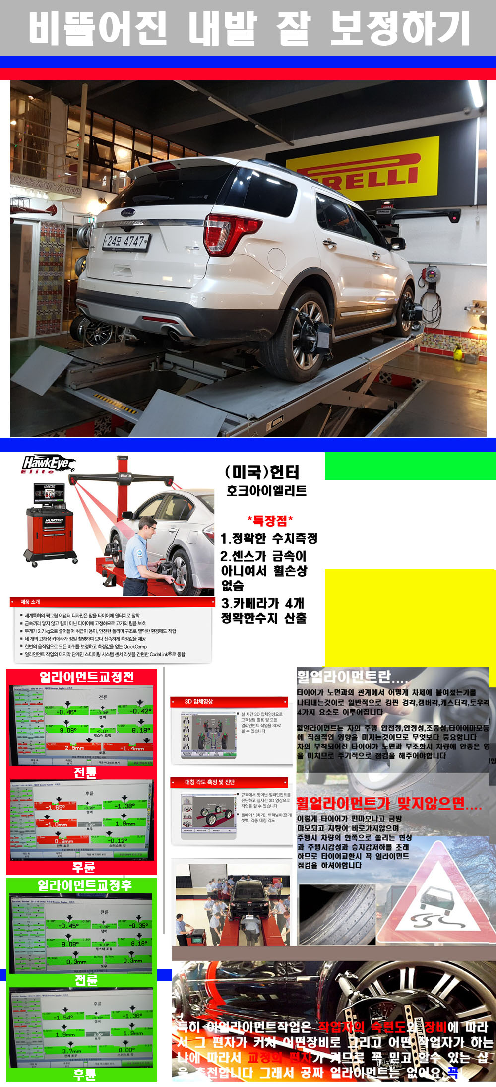자사는 얼라이먼트정렬시 교정전 교정후를 구분하여 고객님께 직접 이수치값을 확인시켜드리고 작업을 하며 이후 각각의 특성을 가진 타이어들에 대해서 설명 및 관리요령 운전요령 같이 설명해드리고 있습니다