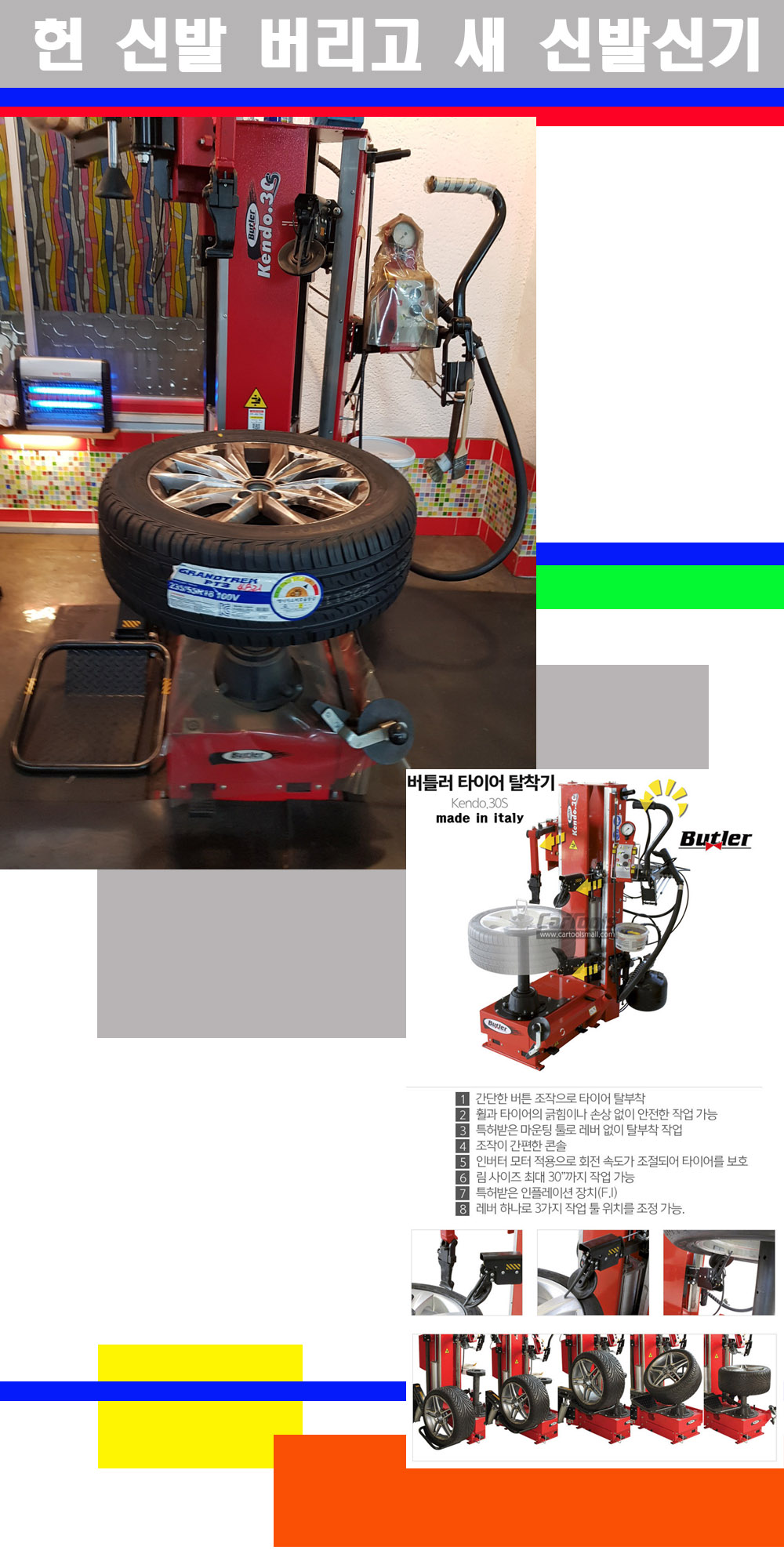 이태리 버틀러사의 켄도3.0S는 휠과 타이어와 조립과 분리시 전혀 제품에 손상을 주지않는 탈착기로 특히 센터락방식(중앙에서 휠를 고정하는 방식)이여서 휠의 중앙부위 잡아서 타이어를 탈부착하고 이후 상하롤러로 타이어를 탈부착합니다 특히 유니포미티작업(휠의 가장가벼운부분과 타이어의 가장 무거운부분을 매칭시키는 작업)시 작업자가 타이어를 정확한 지점에 휠과 매칭시킬수 있는 장점도 있습니다