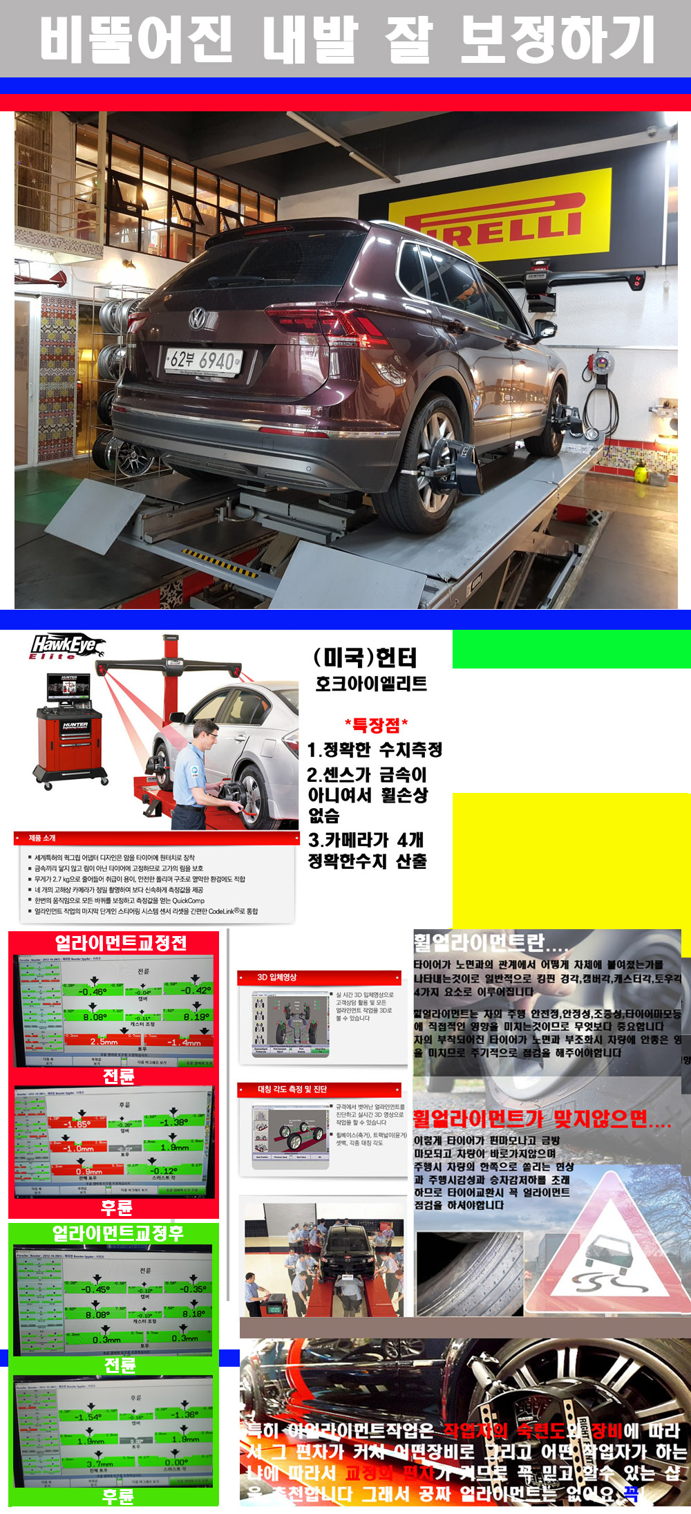 자사는 얼라이먼트정렬시 교정전 교정후를 구분하여 고객님께 직접 이수치값을 확인시켜드리고 작업을 하며 이후 각각의 특성을 가진 타이어들에 대해서 설명 및 관리요령 운전요령 같이 설명해드리고 있습니다