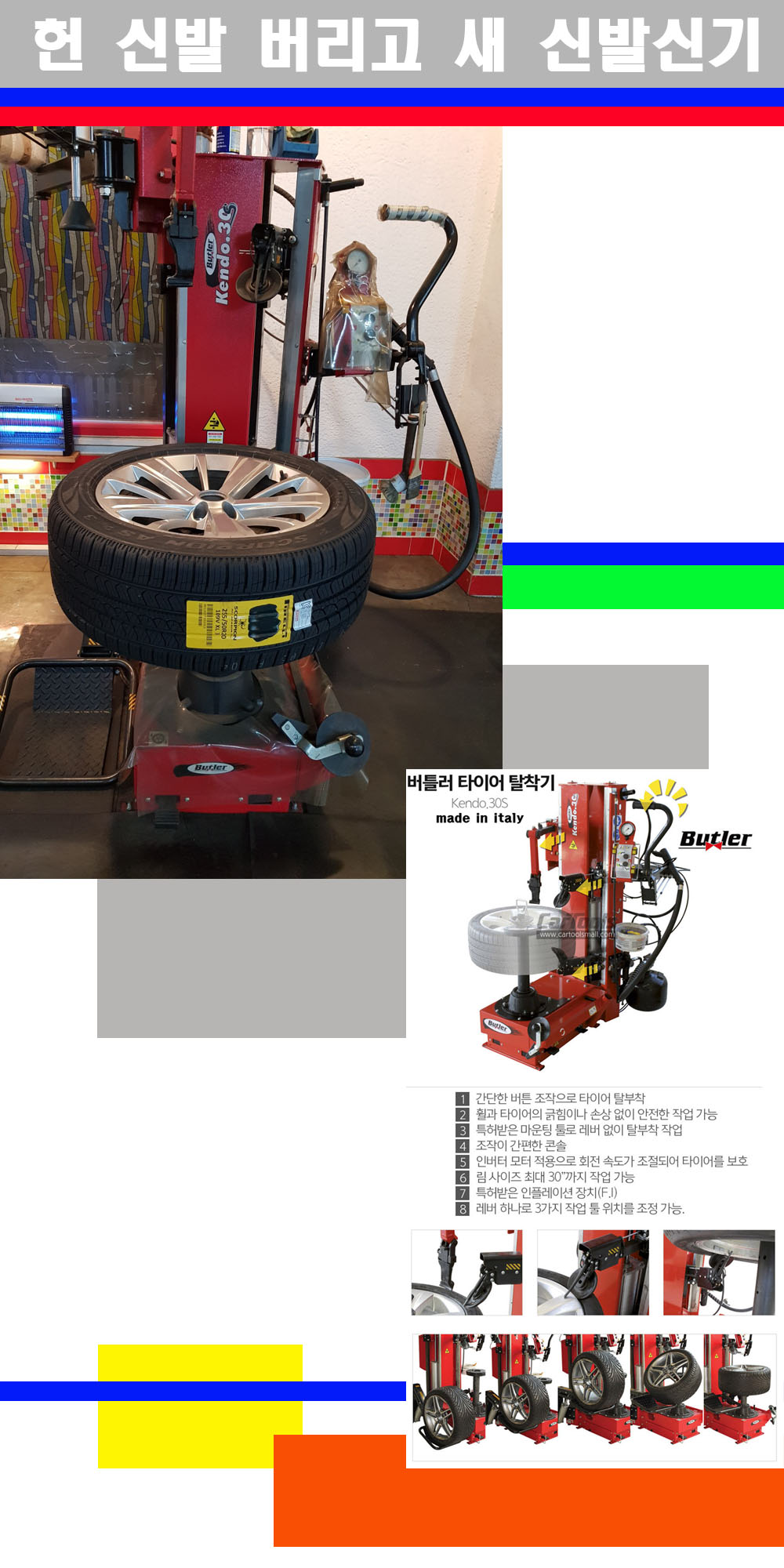 이태리 버틀러사의 켄도3.0S는 휠과 타이어와 조립과 분리시 전혀 제품에 손상을 주지않는 탈착기로 특히 센터락방식(중앙에서 휠를 고정하는 방식)이여서 휠의 중앙부위 잡아서 타이어를 탈부착하고 이후 상하롤러로 타이어를 탈부착합니다 특히 유니포미티작업(휠의 가장가벼운부분과 타이어의 가장 무거운부분을 매칭시키는 작업)시 작업자가 타이어를 정확한 지점에 휠과 매칭시킬수 있는 장점도 있습니다