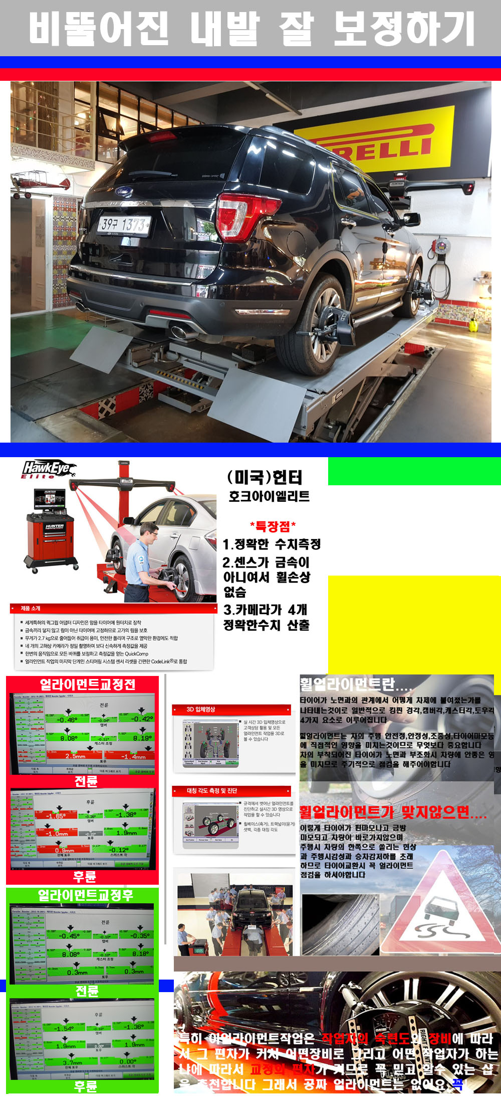자사는 얼라이먼트정렬시 교정전 교정후를 구분하여 고객님께 직접 이수치값을 확인시켜드리고 작업을 하며 이후 각각의 특성을 가진 타이어들에 대해서 설명 및 관리요령 운전요령 같이 설명해드리고 있습니다