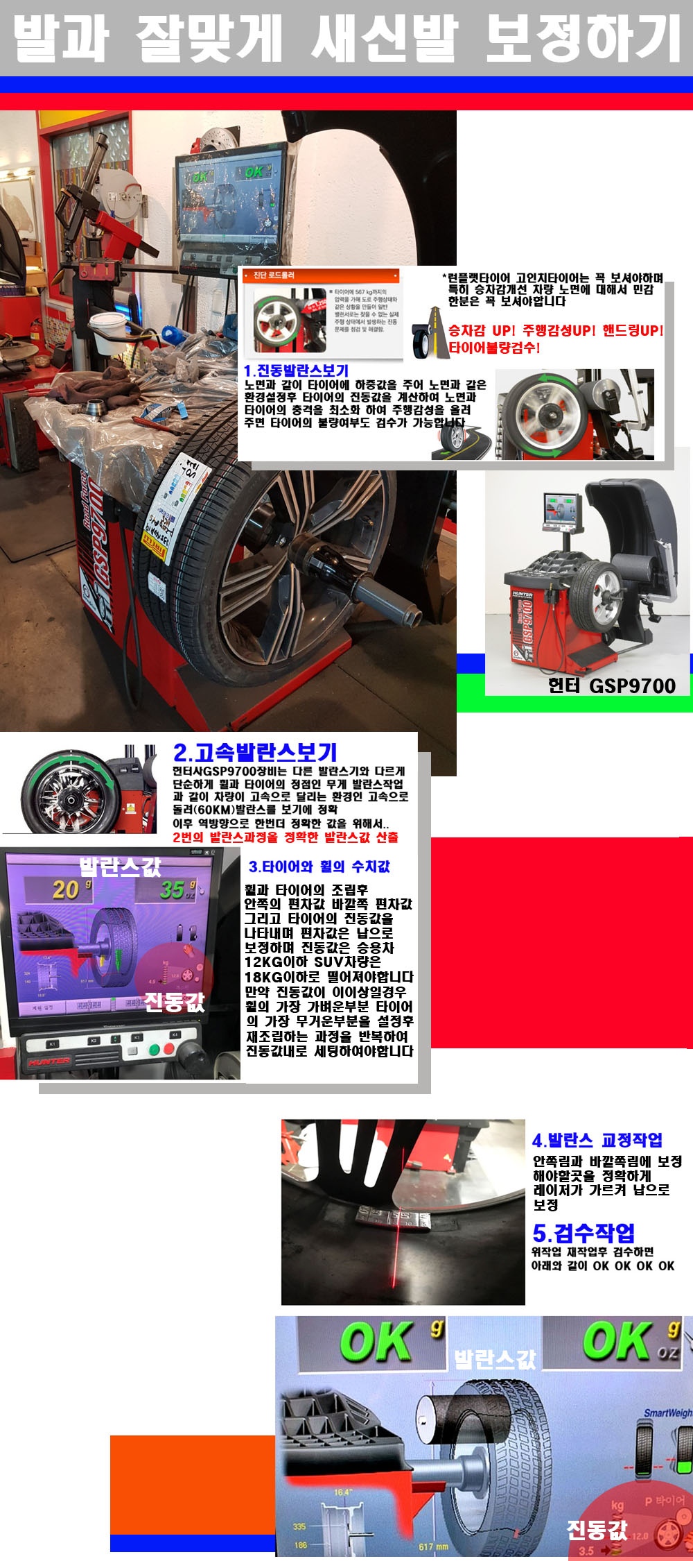 그리고 작업자에게는 불필요한 발란스납을 붙이지 않아 미관상으로 좋고 납을 절약하는 고객님에게도윈이고 작업자에게도 윈윈할수 있는 장비입니다 그리고 시중에서 고속진동발란스라고 말하시는 샵들이 많은데 꼭아셔야하는것은 고속발란스는 말그대로 발란스를 볼때 고속으로 돌리기에 60키로 전후 그리고 진동값을 계산하기위해서는 발란스기에 진동롤러가 있어야합니다 그래서 미국헌터사 GSP9700장비가 유일합니다 다른 샵에서 말하는 발란스기는 고속진동발란스기능없는 일반발란스 기기입니다 이점 꼭 아시고 장착하시기를 바랍니다
