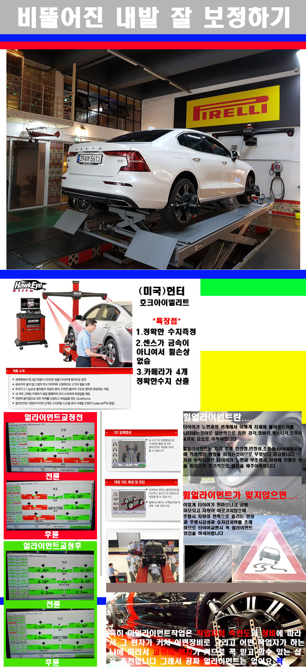 자사는 얼라이먼트정렬시 교정전 교정후를 구분하여 고객님께 직접 이수치값을 확인시켜드리고 작업을 하며 이후 각각의 특성을 가진 타이어들에 대해서 설명 및 관리요령 운전요령 같이 설명해드리고 있습니다