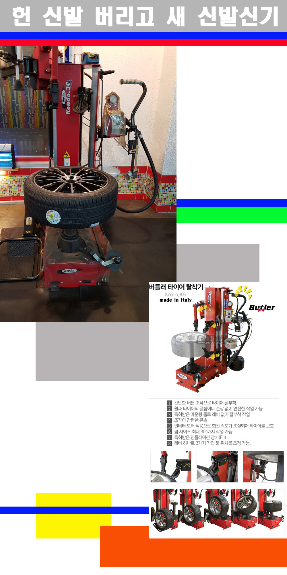 이태리 버틀러사의 켄도3.0S는 휠과 타이어와 조립과 분리시 전혀 제품에 손상을 주지않는 탈착기로 특히 센터락방식(중앙에서 휠를 고정하는 방식)이여서 휠의 중앙부위 잡아서 타이어를 탈부착하고 이후 상하롤러로 타이어를 탈부착합니다 특히 유니포미티작업(휠의 가장가벼운부분과 타이어의 가장 무거운부분을 매칭시키는 작업)시 작업자가 타이어를 정확한 지점에 휠과 매칭시킬수 있는 장점도 있습니다