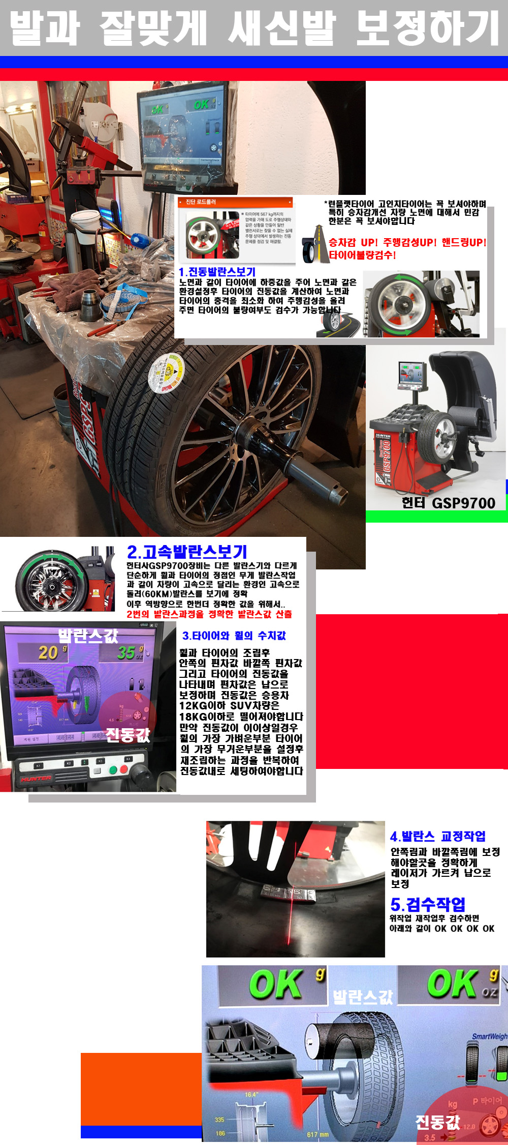 그리고 작업자에게는 불필요한 발란스납을 붙이지 않아 미관상으로 좋고 납을 절약하는 고객님에게도윈이고 작업자에게도 윈윈할수 있는 장비입니다 그리고 시중에서 고속진동발란스라고 말하시는 샵들이 많은데 꼭아셔야하는것은 고속발란스는 말그대로 발란스를 볼때 고속으로 돌리기에 60키로 전후 그리고 진동값을 계산하기위해서는 발란스기에 진동롤러가 있어야합니다 그래서 미국헌터사 GSP9700장비가 유일합니다 다른 샵에서 말하는 발란스기는 고속진동발란스기능없는 일반발란스 기기입니다 이점 꼭 아시고 장착하시기를 바랍니다
