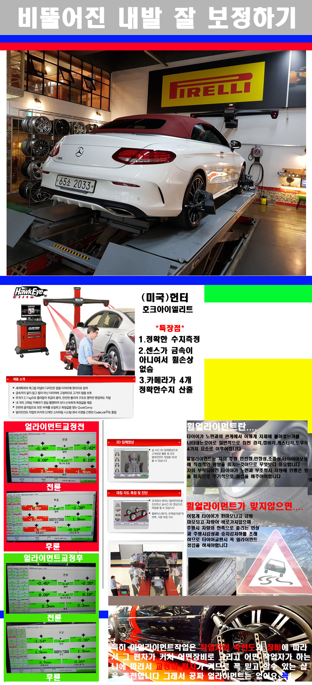 자사는 얼라이먼트정렬시 교정전 교정후를 구분하여 고객님께 직접 이수치값을 확인시켜드리고 작업을 하며 이후 각각의 특성을 가진 타이어들에 대해서 설명 및 관리요령 운전요령 같이 설명해드리고 있습니다