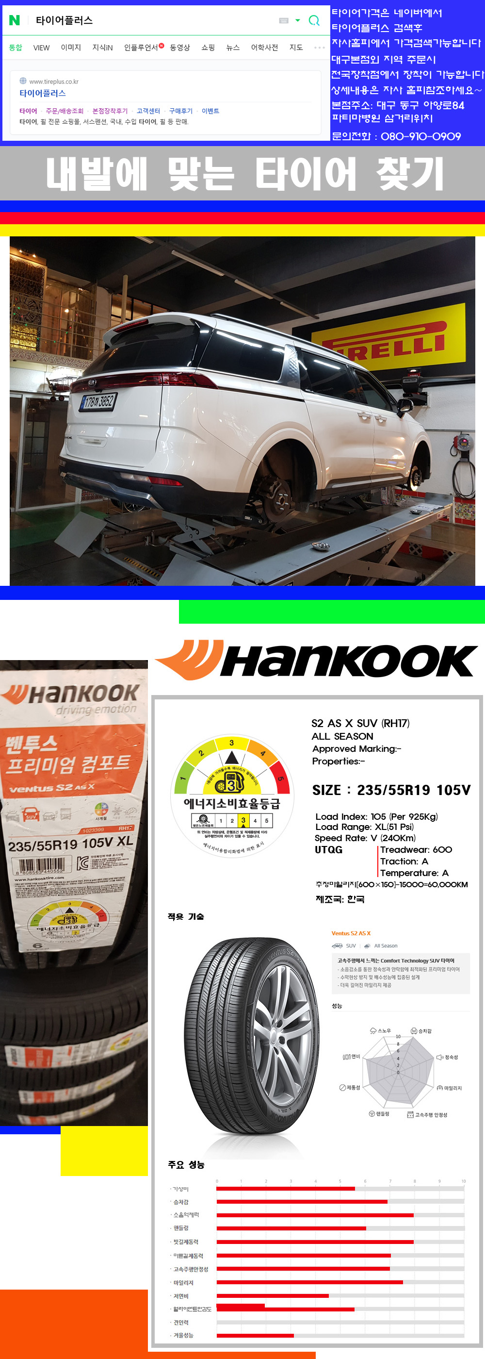 물론 한국 금호 넥센 브리지스톤 미쉐린 콘티넨탈 피렐리 던롭 굳이어 요코하마 등 세계유수의 10대 브랜드타이어만 취급하고 있습니다 타이어매장중 단일규모로는 아마 전국에서 제일 커지않을까 생각합니다 가격도 인터넷 최저가로 장착해 드리고 있습니다 고객님들이 오시면서 너무 고급스러워 가격도 비싸지 않을까 생각하시는데 네이버에서 타이어플러스사이트를 검색해보시면 가격 또한 정말 싸게 판매하고 있구나 하고 생각하실것입니다 물론 장비도 현존하는 장비중 가장 최신장비와 그리고 유럽풍 인테리어의 최고급매장입니다 무엇하나 정품만 취급하며 작업또한 꼼꼼하게 매뉴얼에 따라서 작업을 해드립니다 특히 사장님의 이력이 화려한데 레이스로서 경험한 풍부한 자동차의 지식을 갖춘분이십니다 그래서 사장님께서 직접상담해주시고 장착도 해주시는 매장이기에 더 신뢰가 가지 않을까 생각합니다 자사는 인터넷 최저가 기반으로 성장한 회사이기에 가격또한 인터넷 최저가로 장착해 드리고 있습니다 그리고 자사는 고객만족도에서 대상까지 수상한 회사입니다 그래서 한번 저의 매장에서 작업하신 고객님은 아마 다른곳에서는 아마 눈에 차지 않을것이라 생각합니다 가격이면 가격 작업의 완성도면 완성도 그리고 사후 관리까지 최고중에 최고가 되기위해서 노력하는 매장입니다 지금까지 어느 매장에서도 느끼지 못한 감성들을 느끼시기를 바랍니다 감사합니다