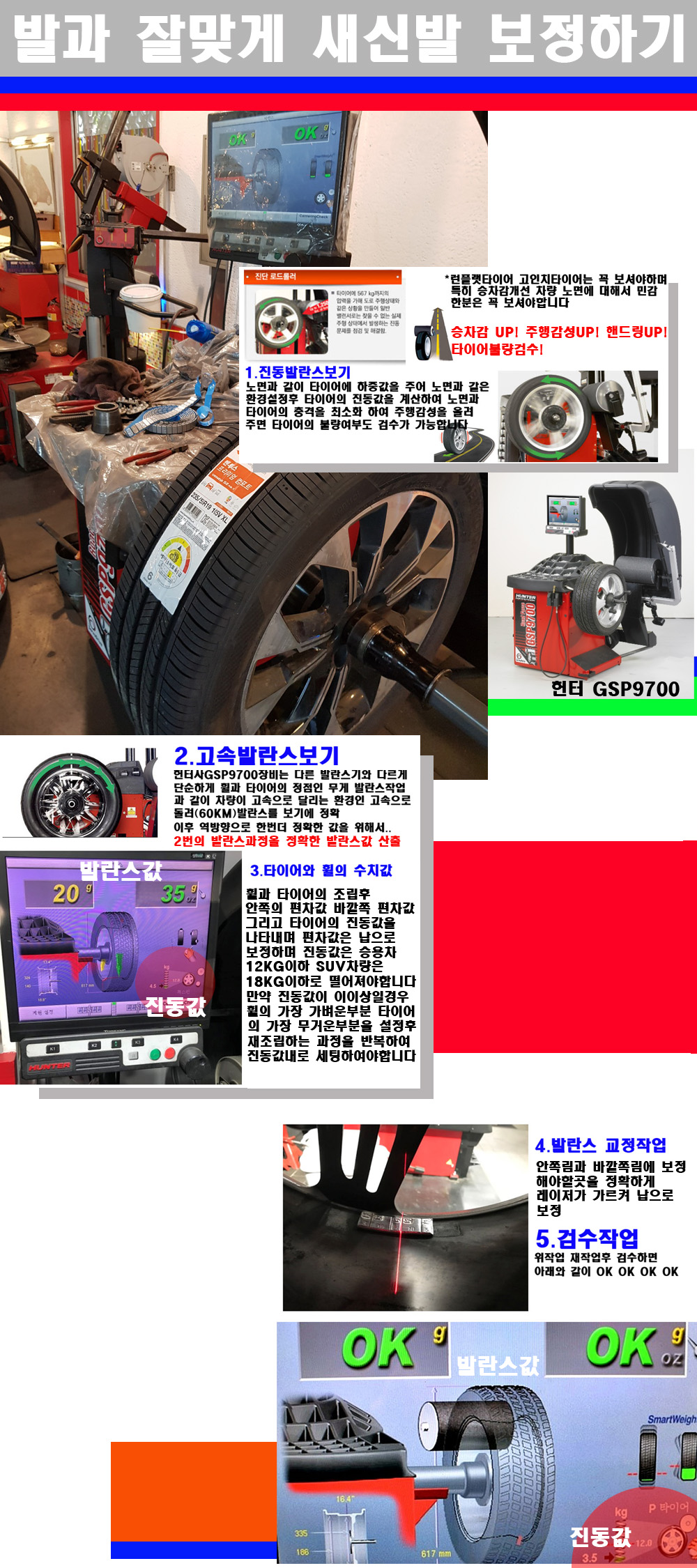 그리고 작업자에게는 불필요한 발란스납을 붙이지 않아 미관상으로 좋고 납을 절약하는 고객님에게도윈이고 작업자에게도 윈윈할수 있는 장비입니다 그리고 시중에서 고속진동발란스라고 말하시는 샵들이 많은데 꼭아셔야하는것은 고속발란스는 말그대로 발란스를 볼때 고속으로 돌리기에 60키로 전후 그리고 진동값을 계산하기위해서는 발란스기에 진동롤러가 있어야합니다 그래서 미국헌터사 GSP9700장비가 유일합니다 다른 샵에서 말하는 발란스기는 고속진동발란스기능없는 일반발란스 기기입니다 이점 꼭 아시고 장착하시기를 바랍니다