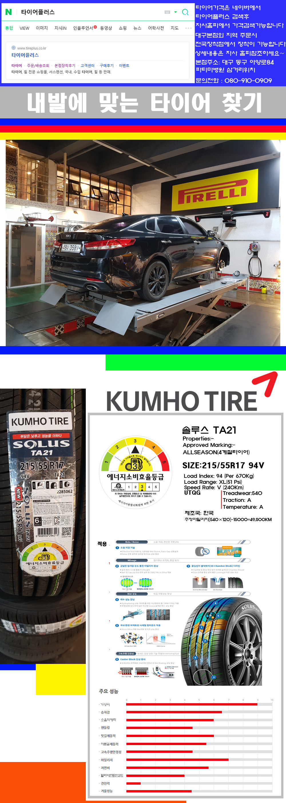 물론 한국 금호 넥센 브리지스톤 미쉐린 콘티넨탈 피렐리 던롭 굳이어 요코하마 등 세계유수의 10대 브랜드타이어만 취급하고 있습니다 타이어매장중 단일규모로는 아마 전국에서 제일 커지않을까 생각합니다 가격도 인터넷 최저가로 장착해 드리고 있습니다 고객님들이 오시면서 너무 고급스러워 가격도 비싸지 않을까 생각하시는데 네이버에서 타이어플러스사이트를 검색해보시면 가격 또한 정말 싸게 판매하고 있구나 하고 생각하실것입니다 물론 장비도 현존하는 장비중 가장 최신장비와 그리고 유럽풍 인테리어의 최고급매장입니다 무엇하나 정품만 취급하며 작업또한 꼼꼼하게 매뉴얼에 따라서 작업을 해드립니다 특히 사장님의 이력이 화려한데 레이스로서 경험한 풍부한 자동차의 지식을 갖춘분이십니다 그래서 사장님께서 직접상담해주시고 장착도 해주시는 매장이기에 더 신뢰가 가지 않을까 생각합니다 자사는 인터넷 최저가 기반으로 성장한 회사이기에 가격또한 인터넷 최저가로 장착해 드리고 있습니다 그리고 자사는 고객만족도에서 대상까지 수상한 회사입니다 그래서 한번 저의 매장에서 작업하신 고객님은 아마 다른곳에서는 아마 눈에 차지 않을것이라 생각합니다 가격이면 가격 작업의 완성도면 완성도 그리고 사후 관리까지 최고중에 최고가 되기위해서 노력하는 매장입니다 지금까지 어느 매장에서도 느끼지 못한 감성들을 느끼시기를 바랍니다 감사합니다